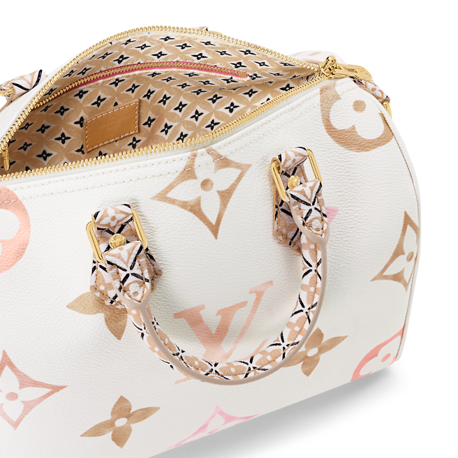 Crafted from coated canvas the Speedy Bandoulière 25 handbag is adorned with a Giant Monogram pattern in nuances of pastel. The complex motifs on the trim handles handle mounts and lining in the same colorway as the rest of the bag are inspired by the tiles at the House’s workshops in Asnières just outside Paris.