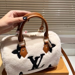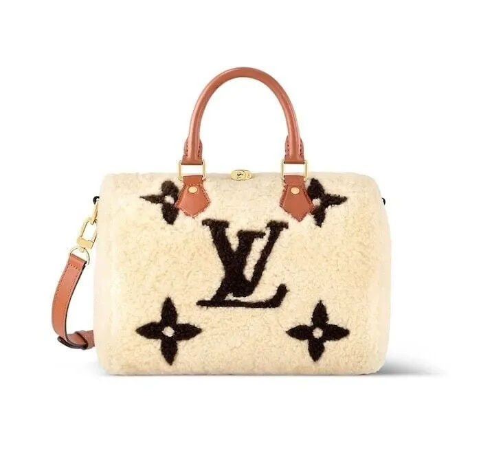The Speedy Bandoulière 25 gets a wintry makeover with this version crafted from soft shearling with grained-leather trim. The Giant Monogram pattern is achieved with a sophisticated intarsia technique that mixes two different colors of shearling. Two rolled-leather top handles and a leather shoulder strap – removable and adjustable – make it versatile.