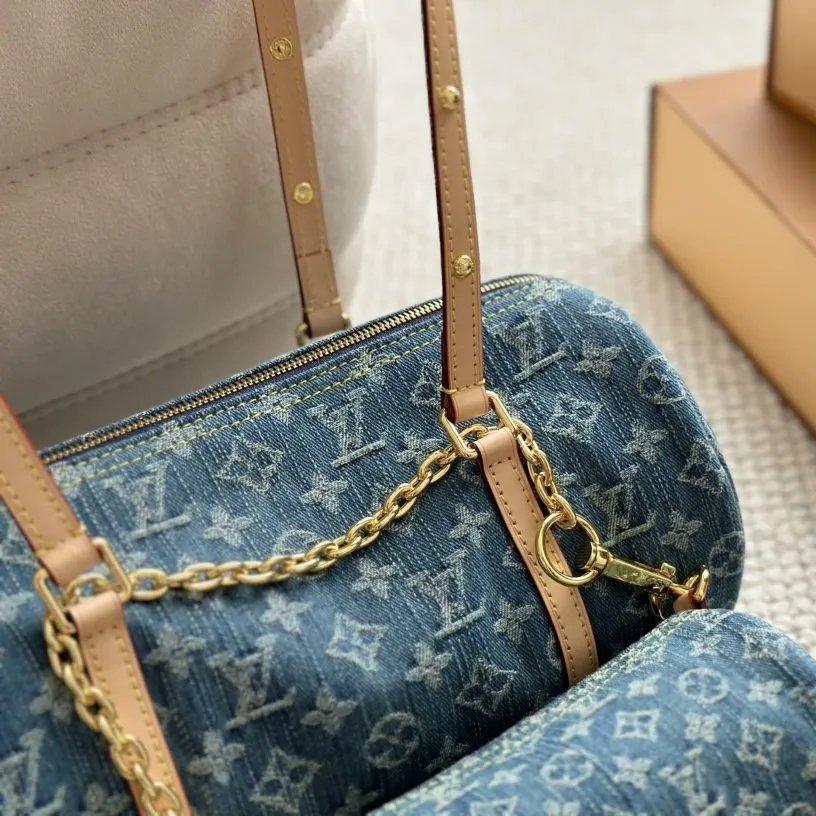 The Papillon handbag is made from Monogram Denim and features a miniature Papillon bag attached to the bag. Monogram Denim is created through a multi-step process that begins by weaving the Monogram motif into the cotton. Next the cotton is bleached and then the bag assembled. Finally the bag is stonewashed making it unique.