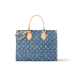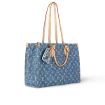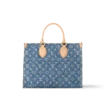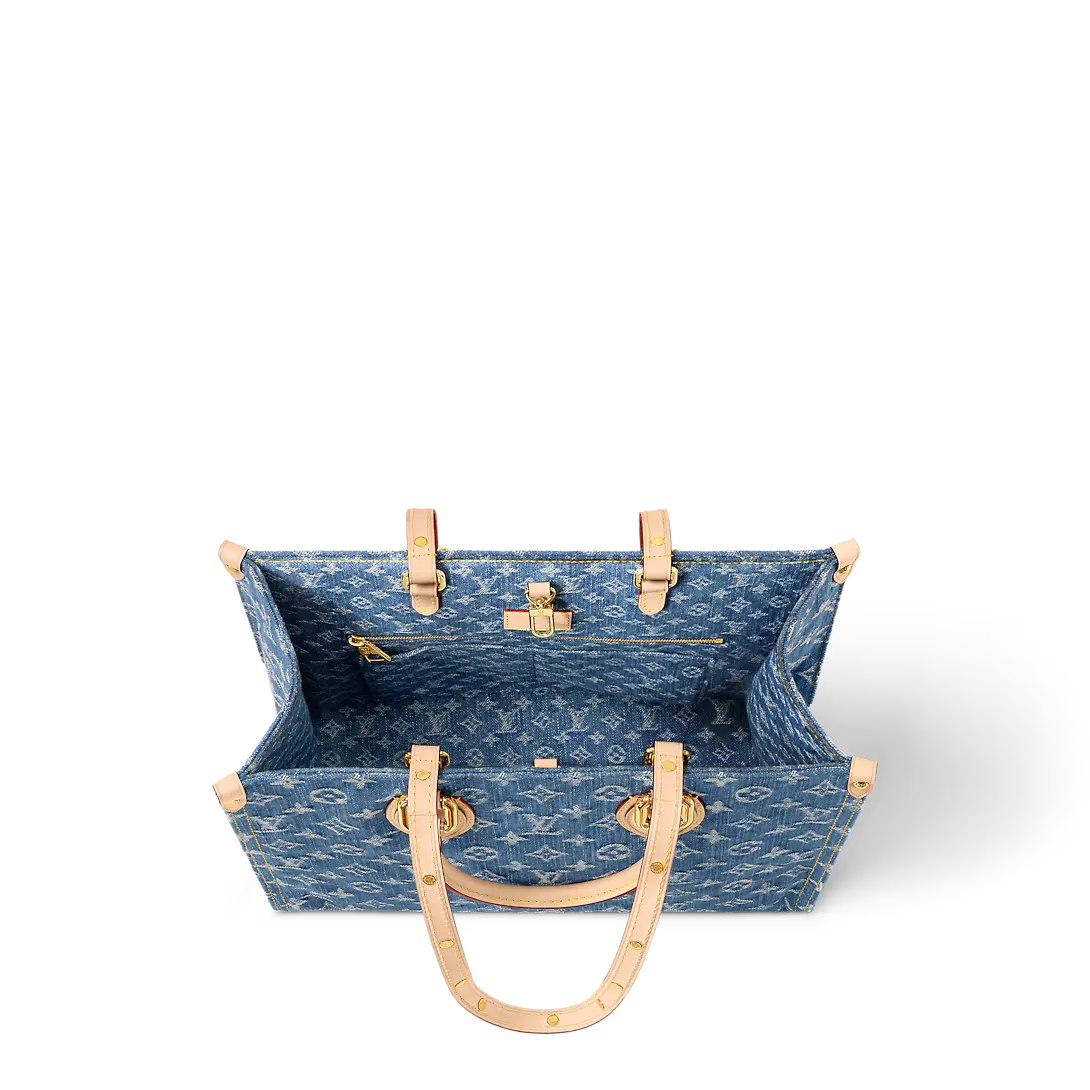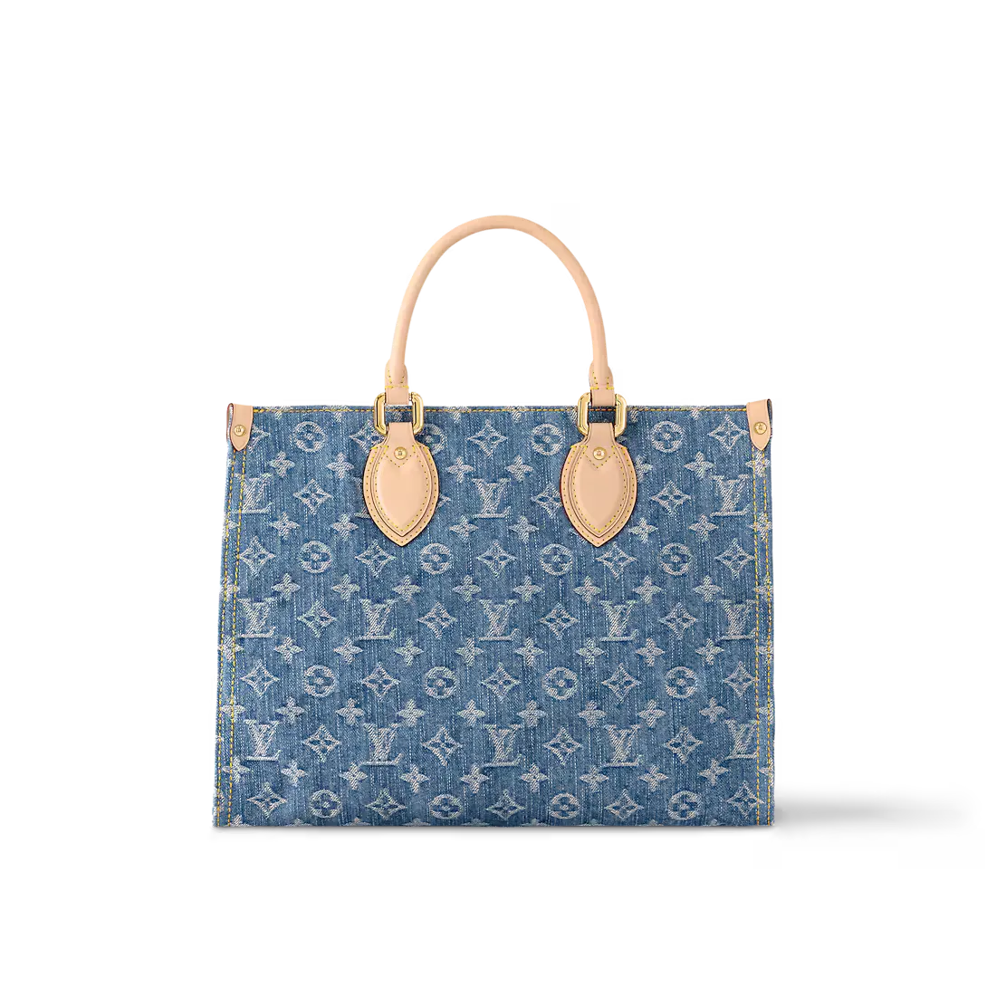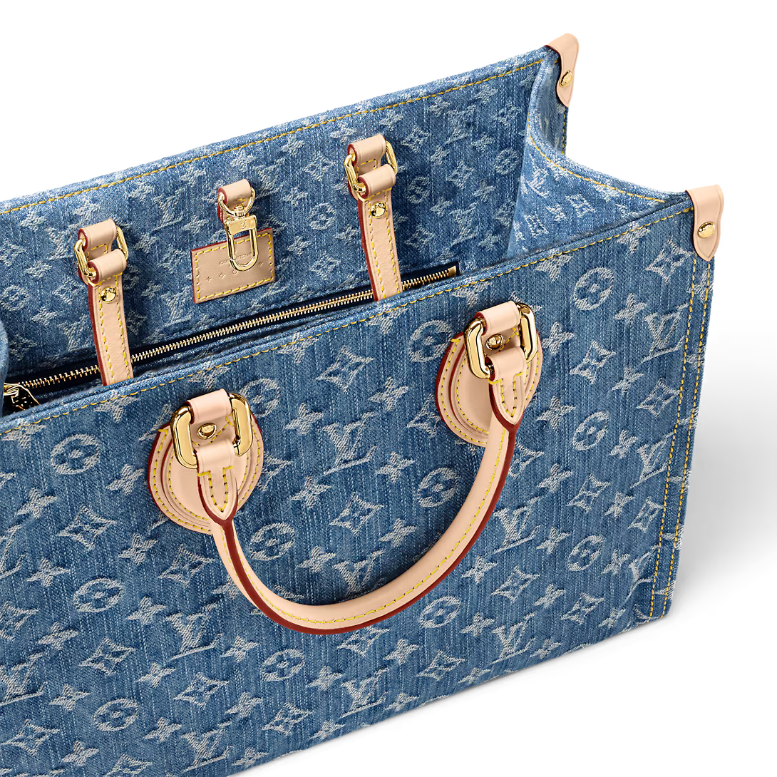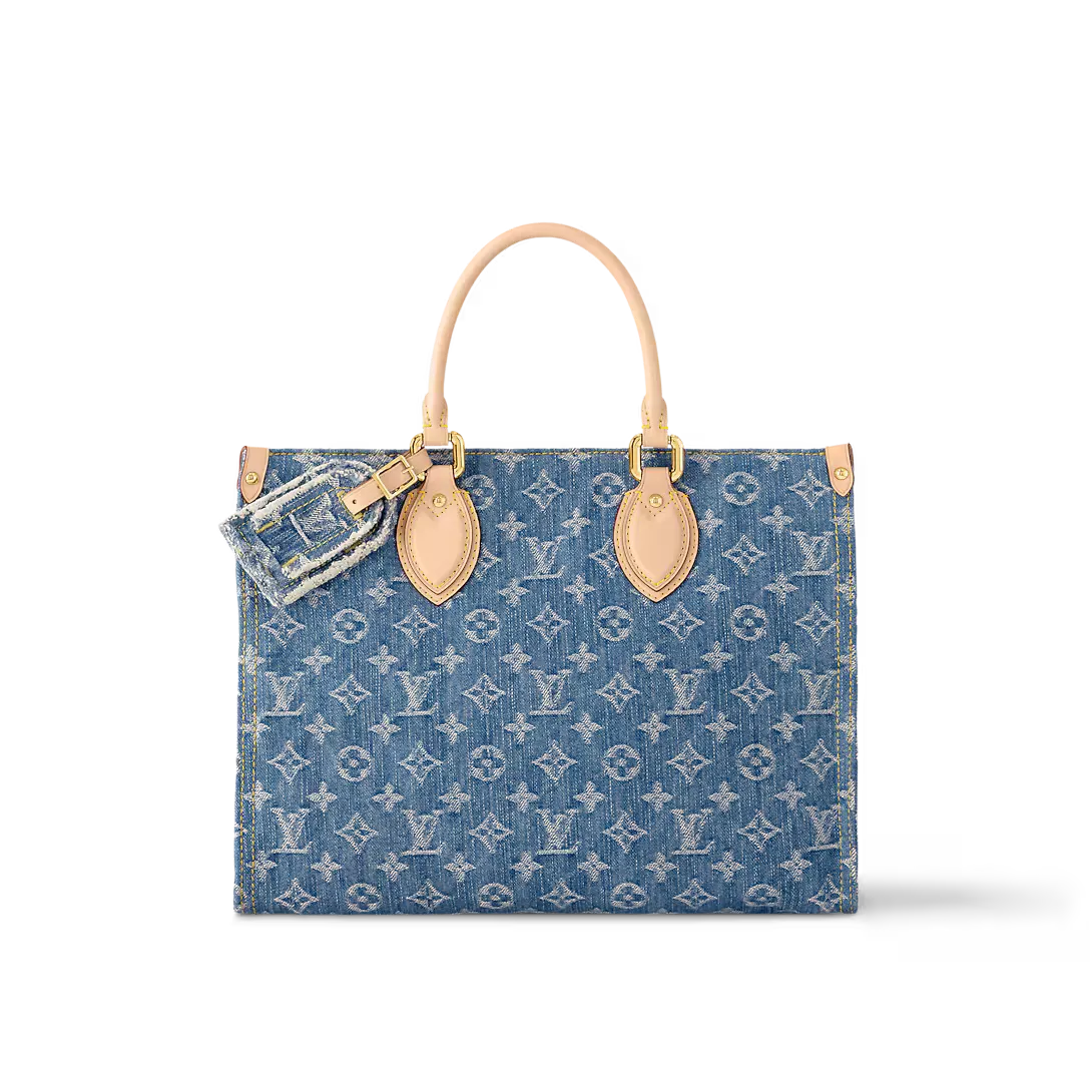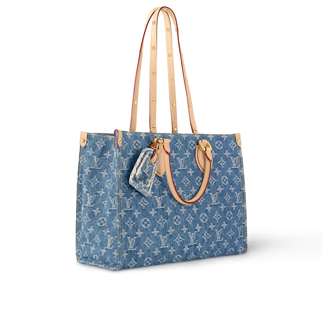 The OnTheGo MM Tote is crafted from new Monogram Denim canvas with natural cowhide leather for the top handle and handle bracket. Thanks to its square shape OnTheGo is large enough to accommodate a laptop. Its rolled leather top handles and two longer shoulder straps allow for a variety of carry options.