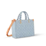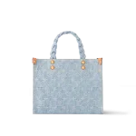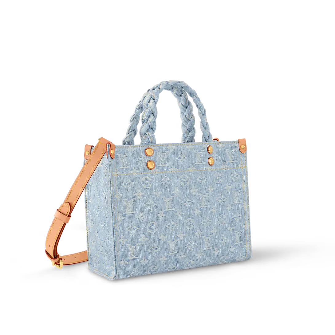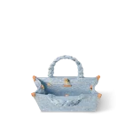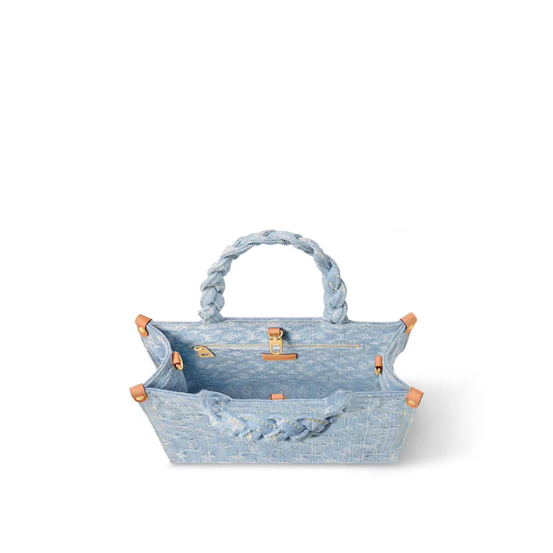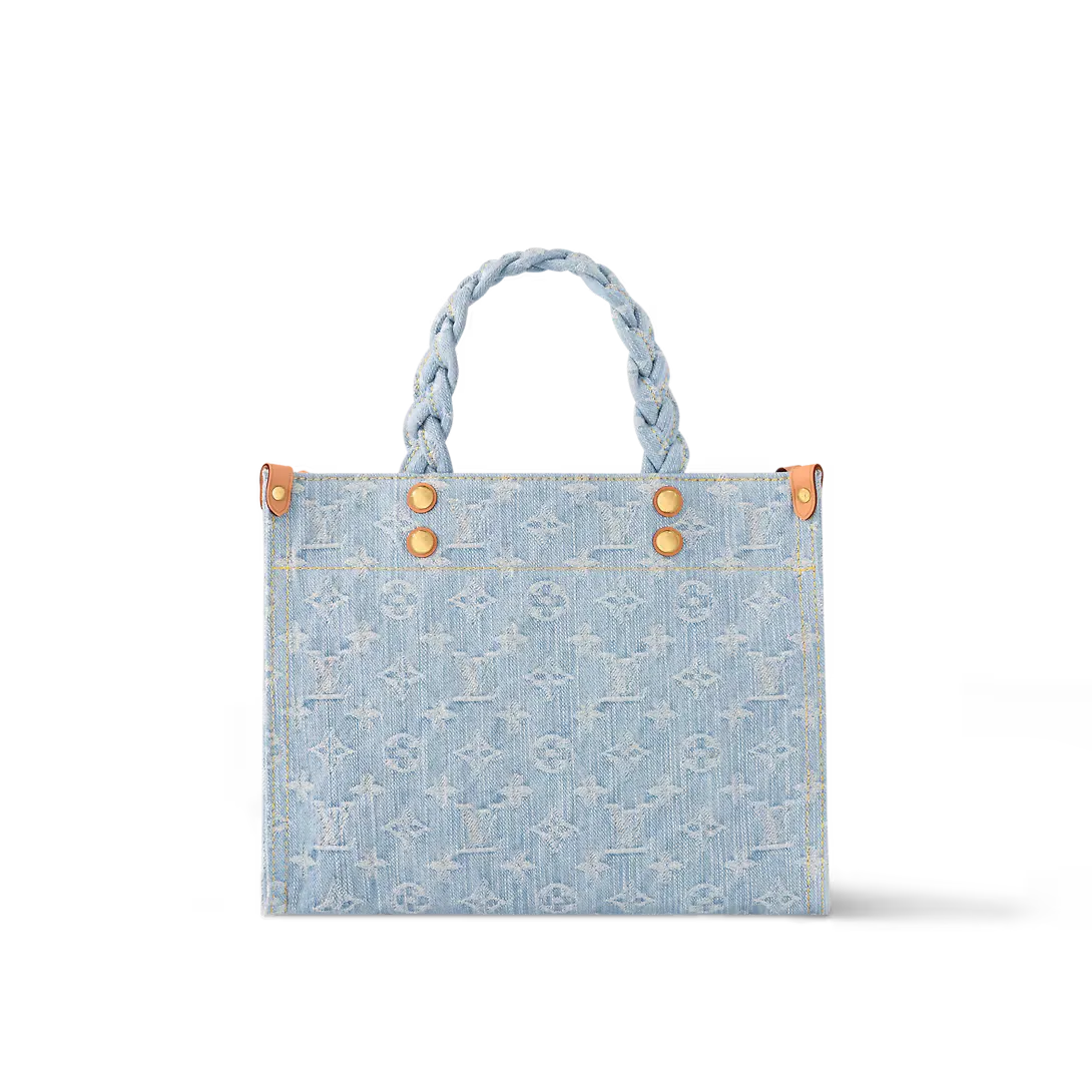 Made from Monogram Denim the cute little LetGo PM tote is inspired by the design of the OnTheGo. The stonewashed colorway and braided handles make this perfect for summer. Large enough for a wallet and phone its supple design makes it a pleasure to carry. The riveted corners are in cowhide leather.