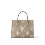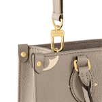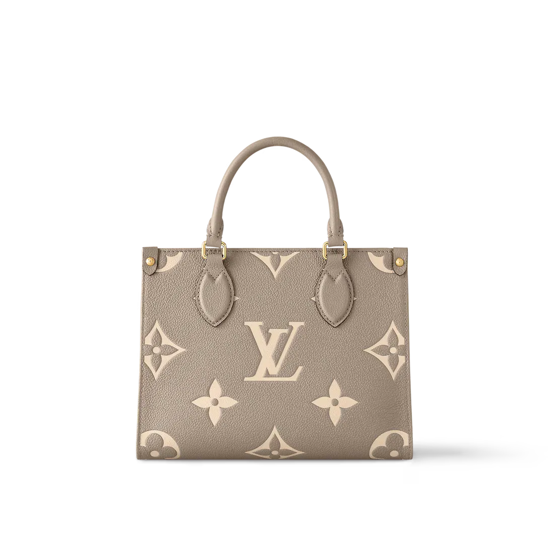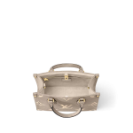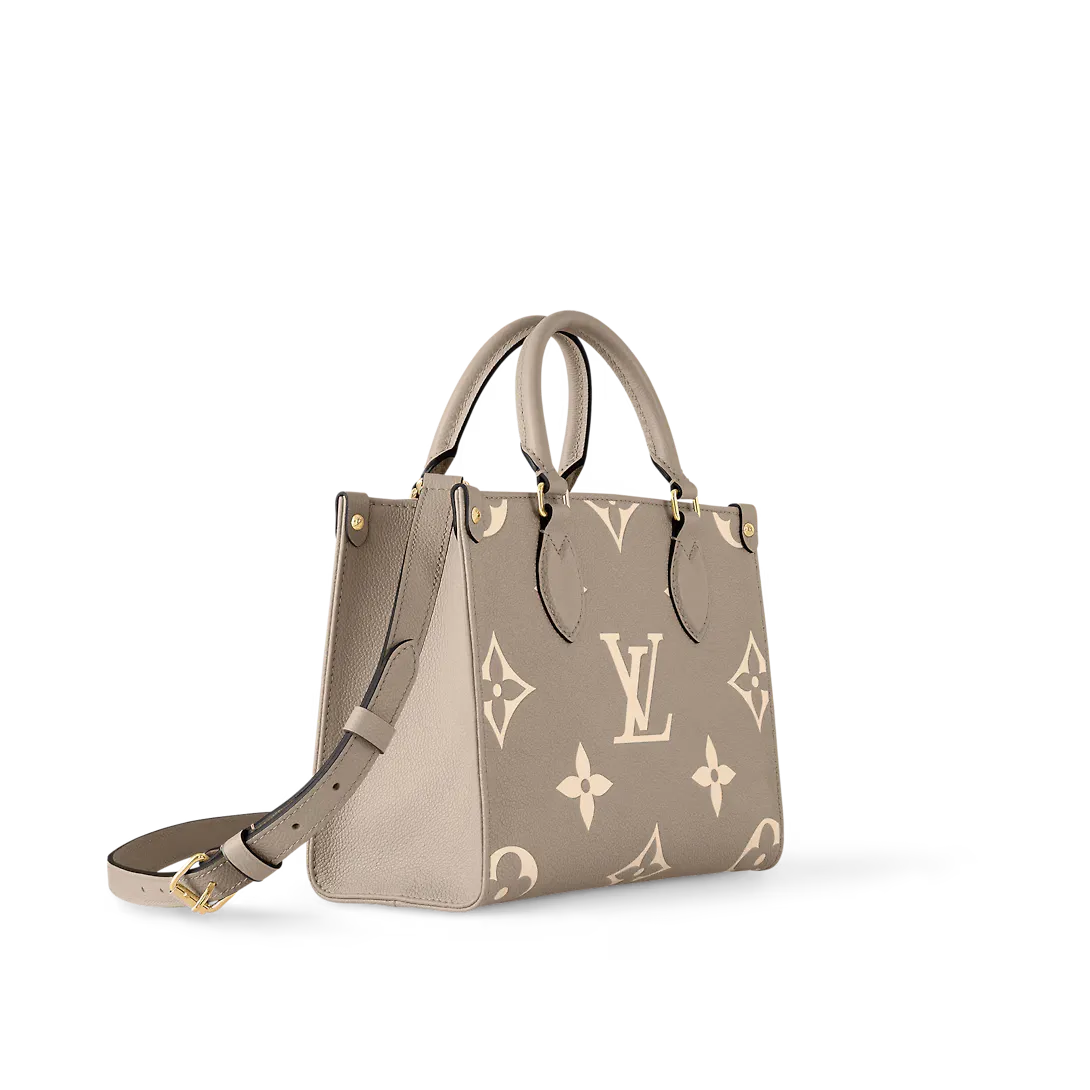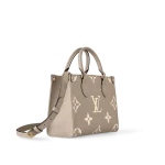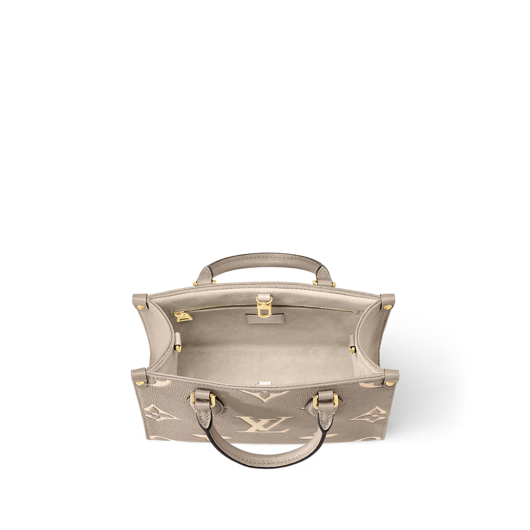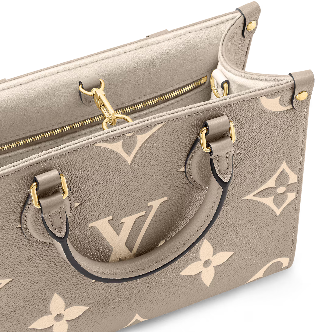 Inspired by Louis Vuitton’s famous Sac Plat from 1968 the Onthego PM tote is fashioned in Monogram Empreinte leather embossed with a Giant Bicolor Monogram pattern. This smaller version of the original Onthego fits essentials such as an iPad Mini. Articulated top handles and an adjustable removable strap offer a variety of carry options.