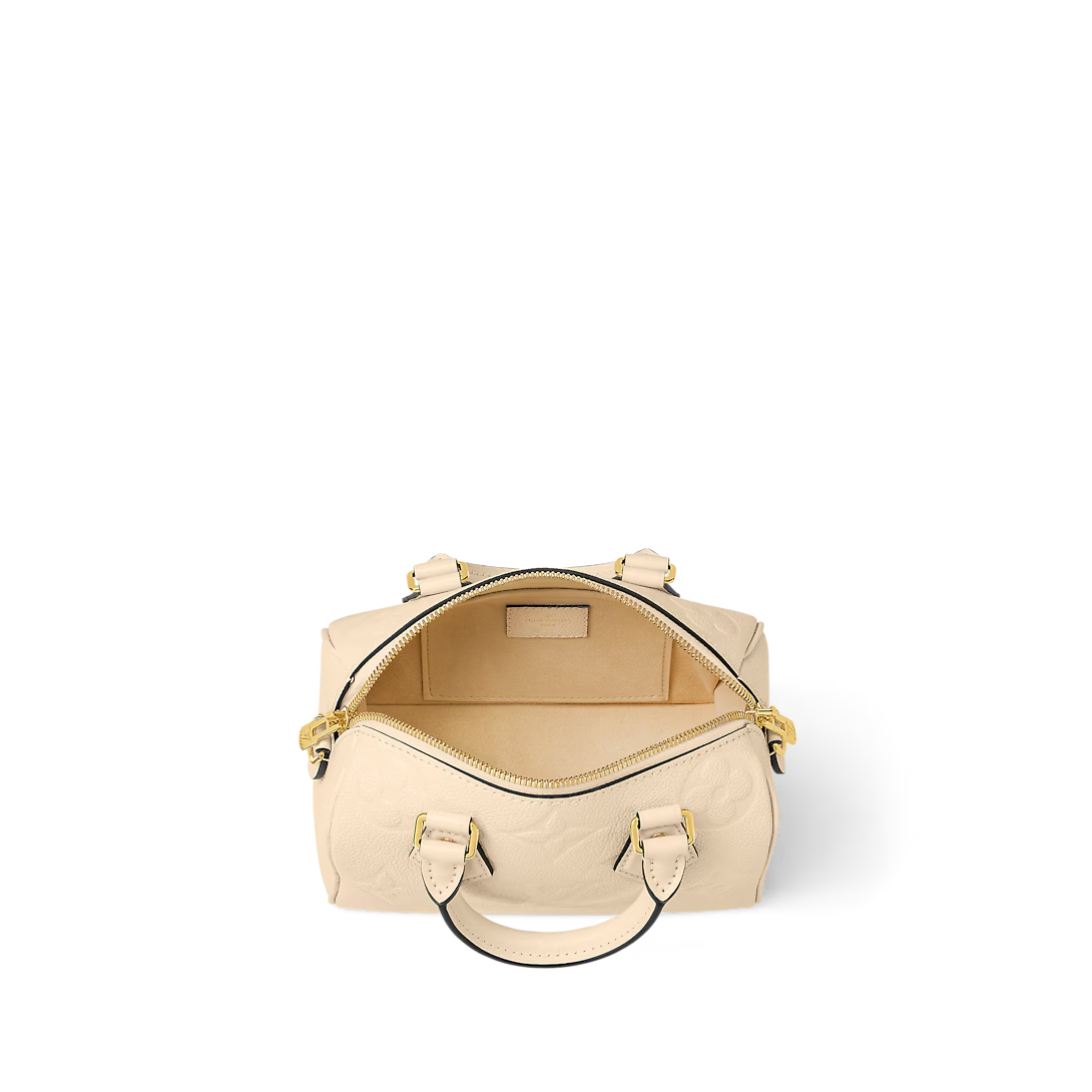 One of the House’s classic silhouettes the Speedy Bandoulière 20 handbag takes on a timeless elegance in cream-color Monogram Empreinte leather with matching microfiber lining. The bag’s unique lines and two top handles evoke Louis Vuitton’s travel bags from the early 20th century. A removable chain-and-leather strap enables comfortable shoulder and cross-body carry.