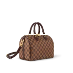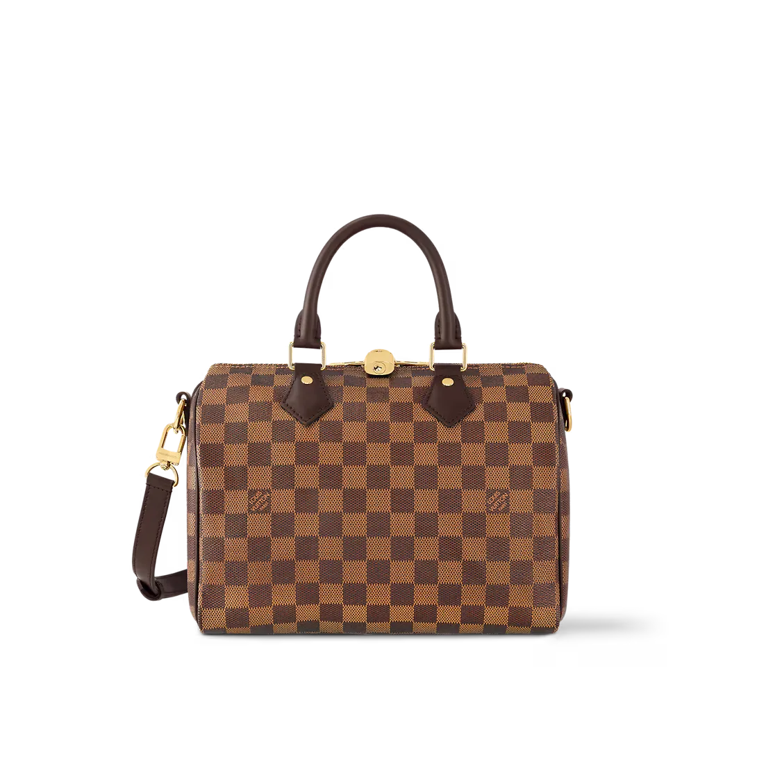 The Speedy Bandoulière 25 in graphic Damier Ebene canvas is an ideal city bag for every day. Originally created for travelers in the 1930s – the name refers to the era’s rapid transit – every feature of the Speedy’s design is iconic from its unmistakable shape to the rolled leather handles engraved padlock and detachable strap.