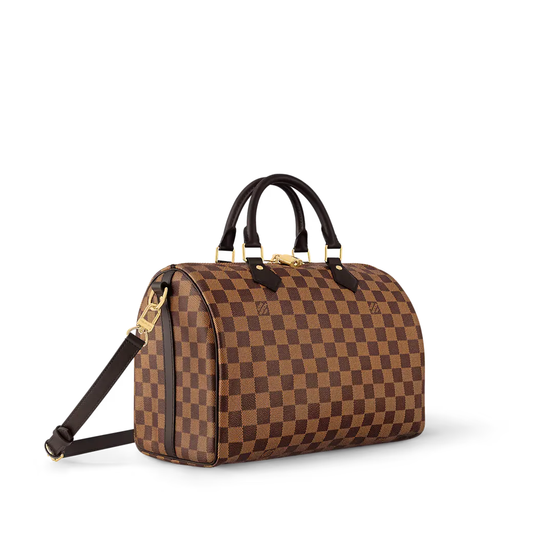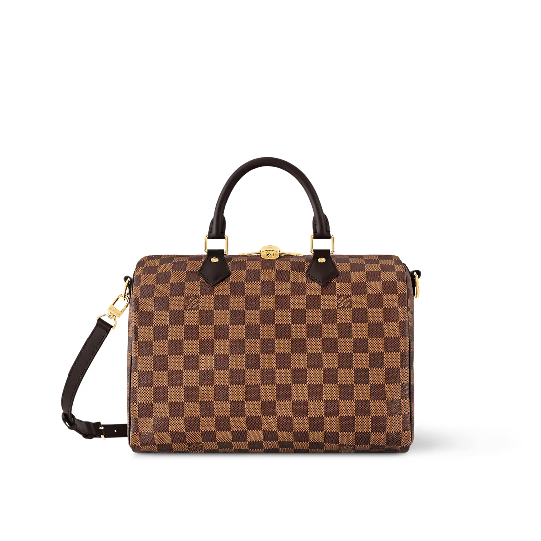 The Speedy Bandoulière 30 in elegant Damier Ebene canvas is an ideal city bag for every day. Originally created for travelers in the 1930s – the name refers to the era’s rapid transit – every feature of the Speedy’s design is iconic from its unmistakable shape to the rolled leather handles engraved padlock and detachable strap.