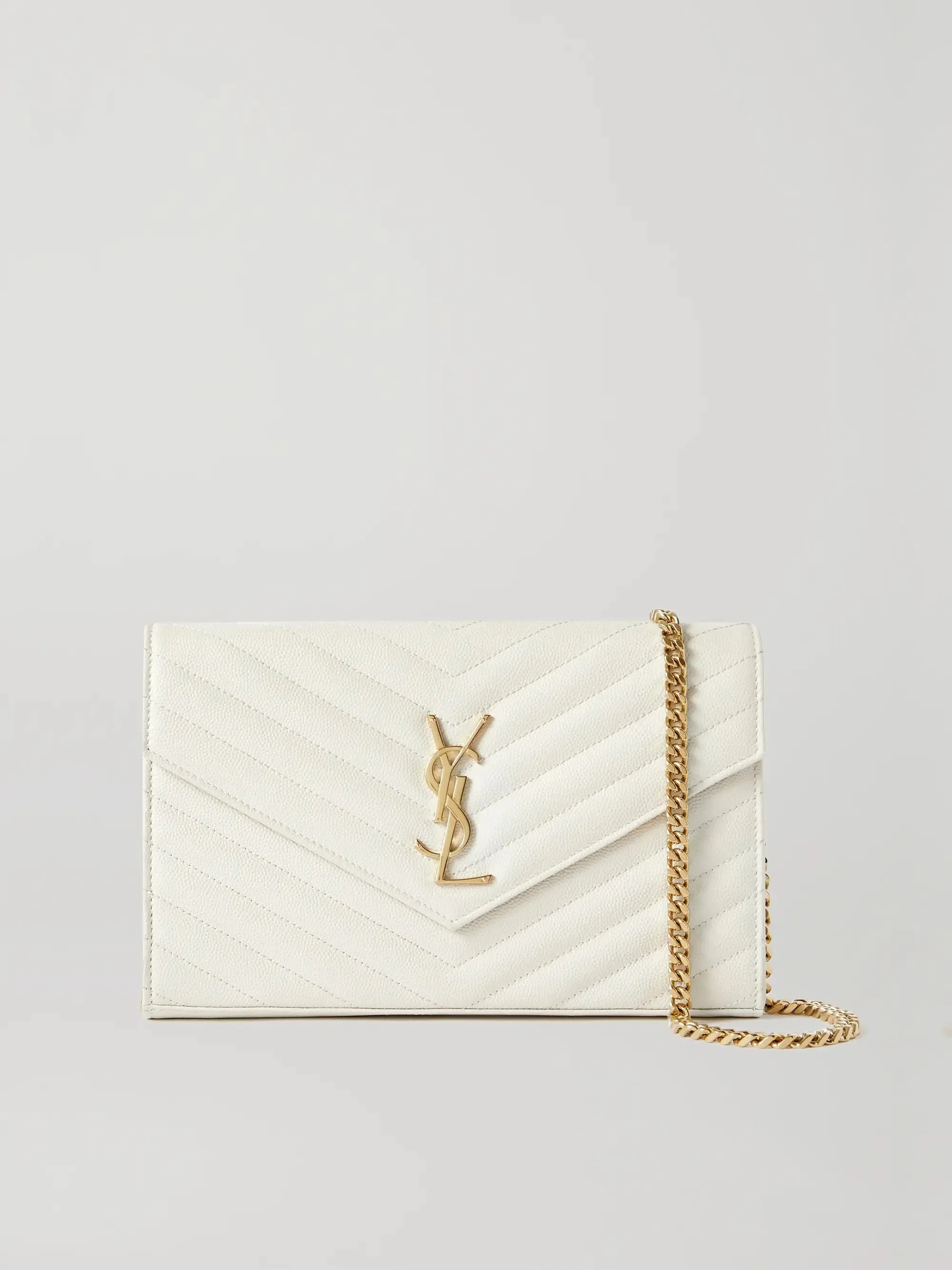 SAINT LAURENT’s wallet has a slim silhouette and a pointed front flap just like an envelope. Intended to stash the smallest essentials it’s made from textured-leather and fitted with six card slots and a slip pocket. Detach the chain strap to hold it as a clutch.
