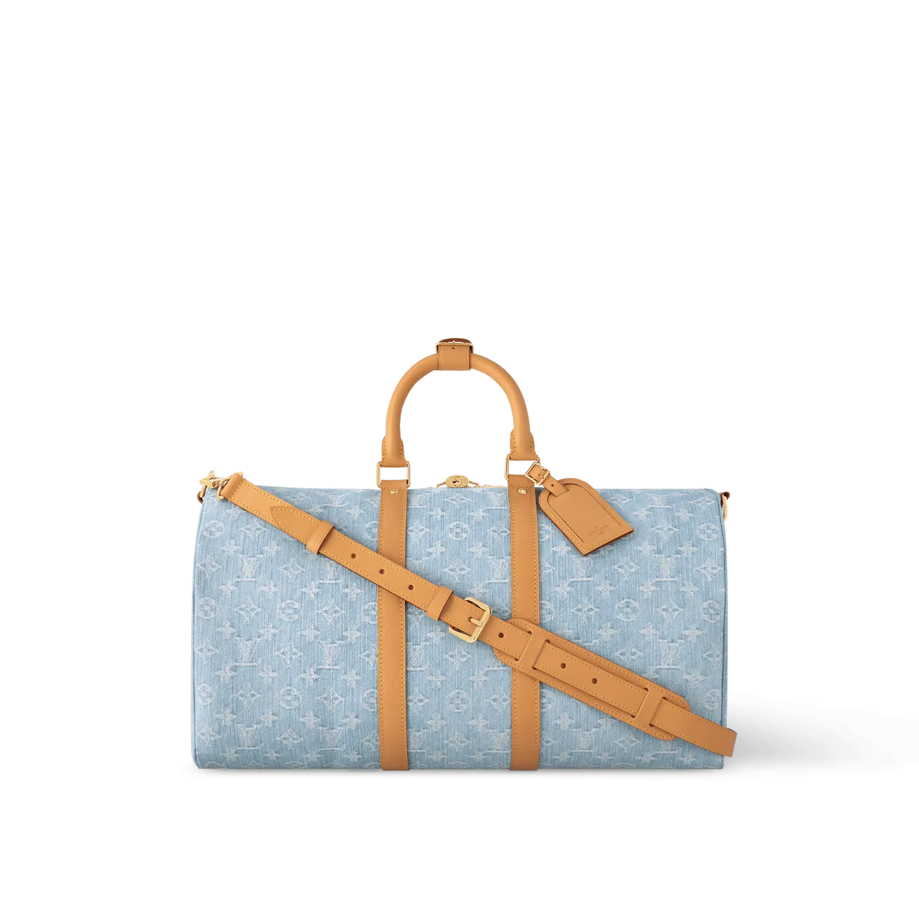 Monogram Denim infuses the Keepall Bandoulière 45 bag with the spirit of summer. A seasonal light blue the bag is made from 100% organic cotton with a woven Monogram pattern. Stonewashed each bag is unique. The cowhide-leather trim on the lateral reinforcement bands and removable shoulder strap complements the denim.