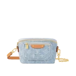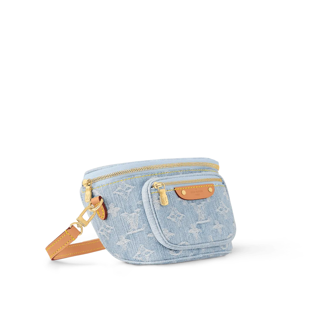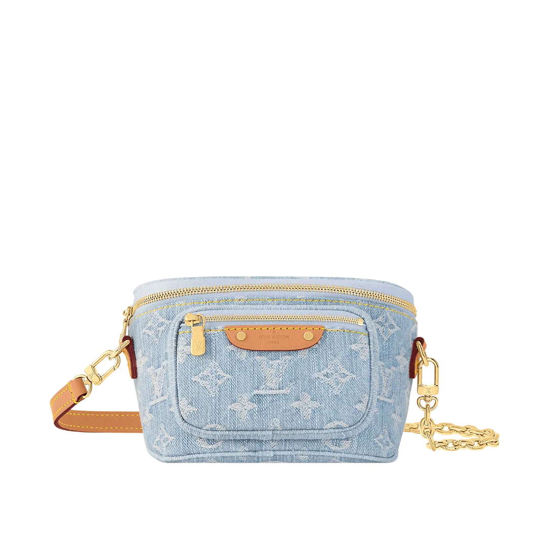 This summery edition of the Mini Bumbag comes in vintage-look denim which is woven with the Monogram pattern then bleached and stonewashed. This on-trend model has a zipped main compartment and a zipped front pocket which is signed with a Louis Vuitton-embossed leather label. Its removable chain and removable adjustable strap offer different carry options.