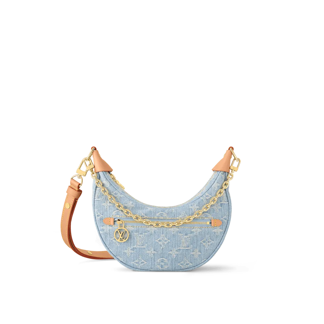 The Loop is made from Monogram Denim a stylishly fresh take on the ultimate summer fabric. The bag’s half-moon shape is highlighted by the leather corners. A removable and adjustable leather strap and a detachable gold-color chain give carry options. The zipped front pocket gives access to essentials.