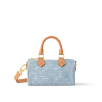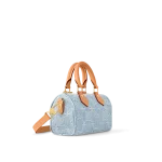 This summery iteration of the Nano Speedy bag comes in pure cotton denim which is first woven with the Monogram pattern then bleached and stonewashed to create a fashionable vintage look. The denim is complemented by natural leather with a subtly aged appearance on the bag’s two handles and removable adjustable shoulder strap.