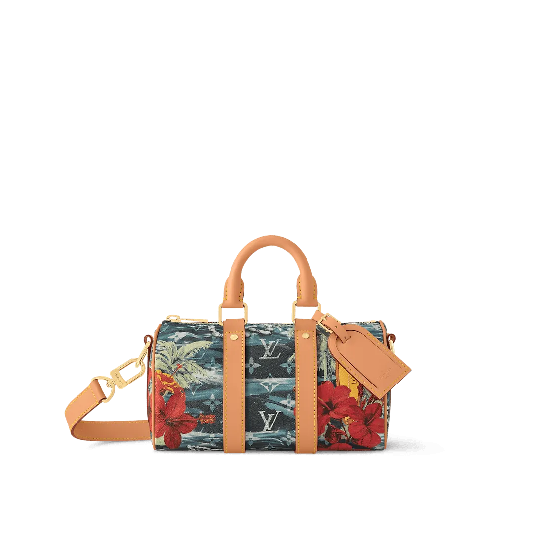 The Keepall Bandoulière 25 is a smaller version of Louis Vuitton’s famous Keepall travel bag. It’s made from Pharrell Williams’ Monogram Surfin’ canvas with its intricate print combining different summery motifs. The bag’s design and tropical print give this city bag a vintage feel. A detachable strap and two rolled-leather top handles enable carry options.