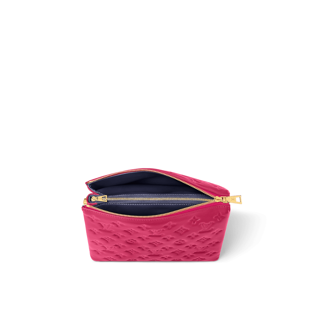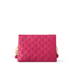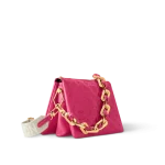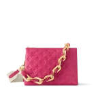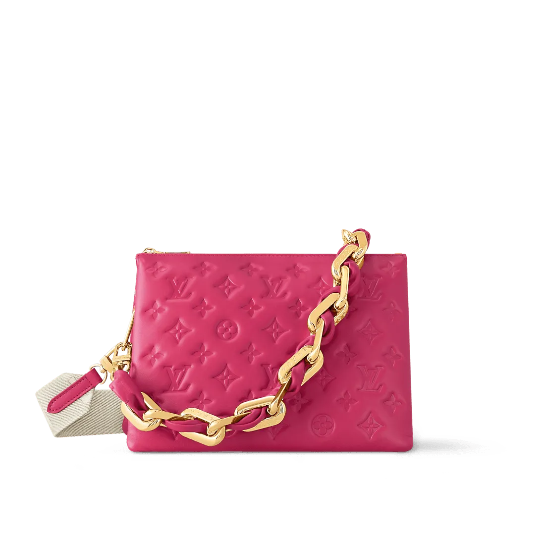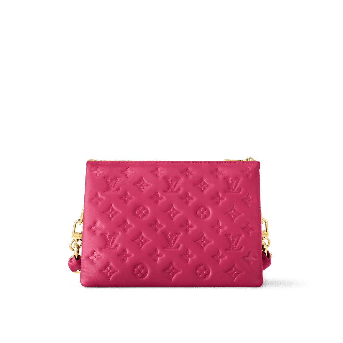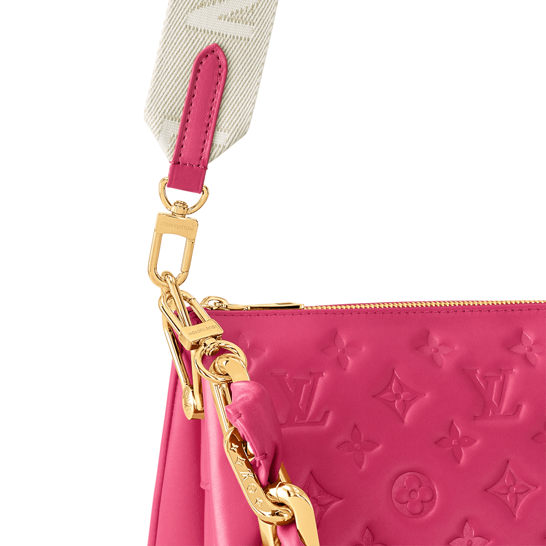 The Coussin PM handbag is made from puffy lambskin embossed with the Monogram pattern. Lined with smooth cowhide the inside of the bag is divided into two compartments by a zipped pocket. This body-friendly bag can be comfortably carried with its wide removable shoulder strap or with its leather braided chunky chain.