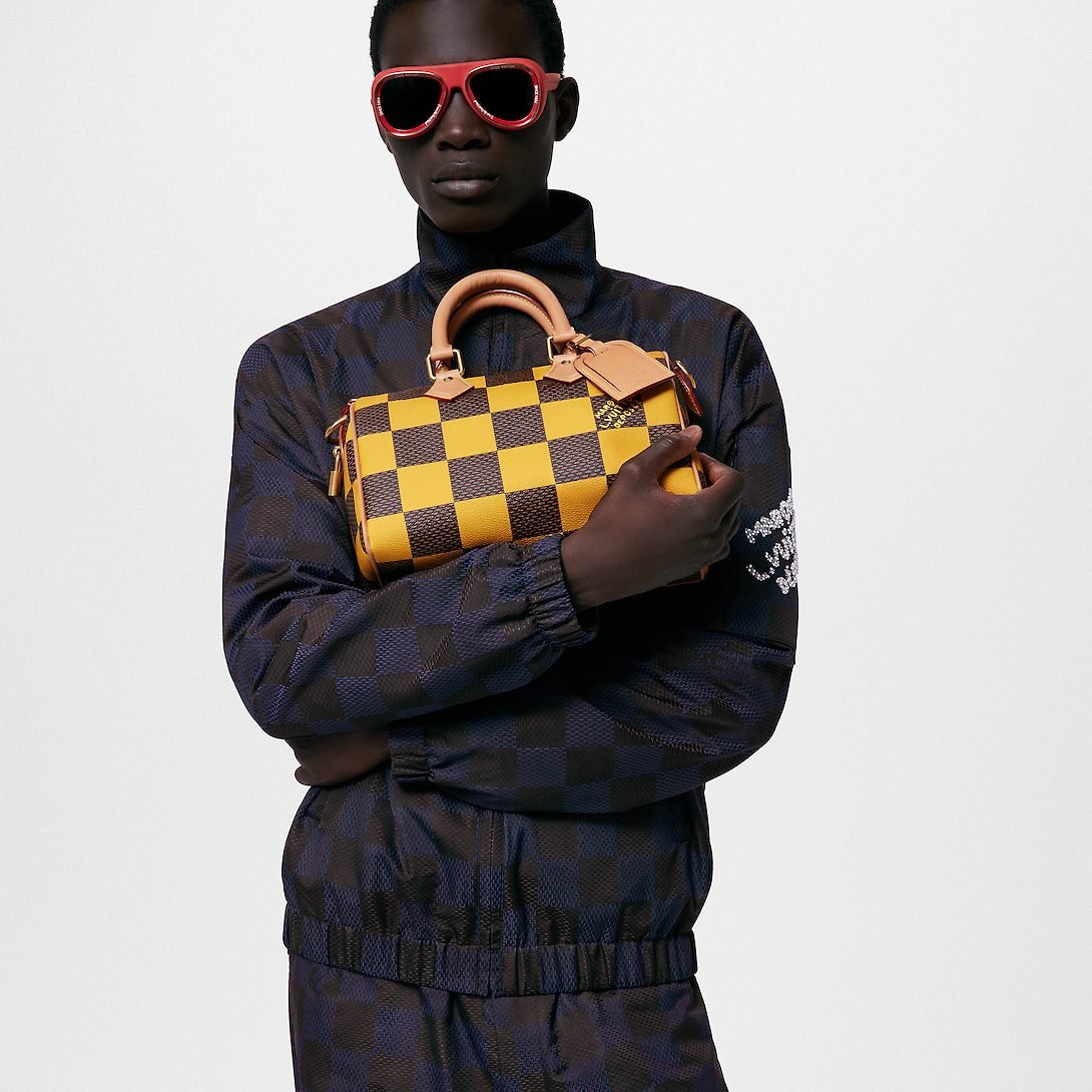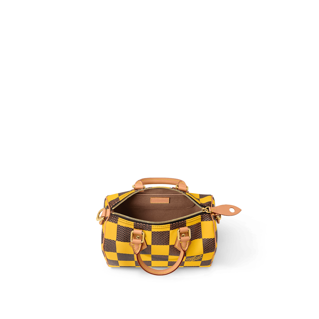 This Speedy 25 Bandoulière Damier Pop displays the same trapezoid lines as the classic Speedy but made from supple Damier Pop coated canvas the bottom of the bag drapes casually. The new colorway brings a touch of playfulness while the natural cowhide-leather trim and polished gold-color hardware pay homage to the House’s classic bags.