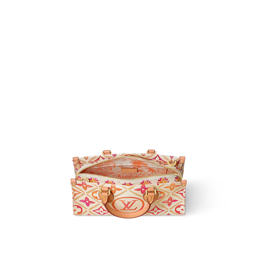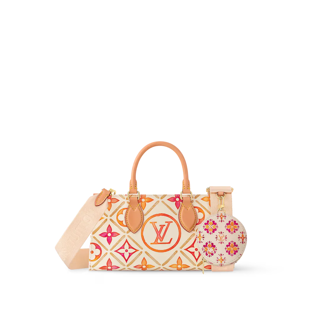 Its striking stretched shape and Monogram Tiles canvas make this OnTheGo East West handbag one of the stars of the LV By The Pool Collection. The irregular pastel treatment of the LV Circle and Monogram Flowers conjure dreams of faraway shores. A wide detachable strap means it can be styled in a variety of ways.