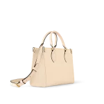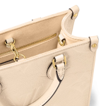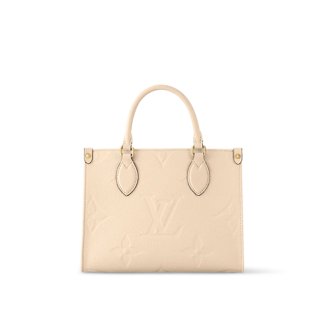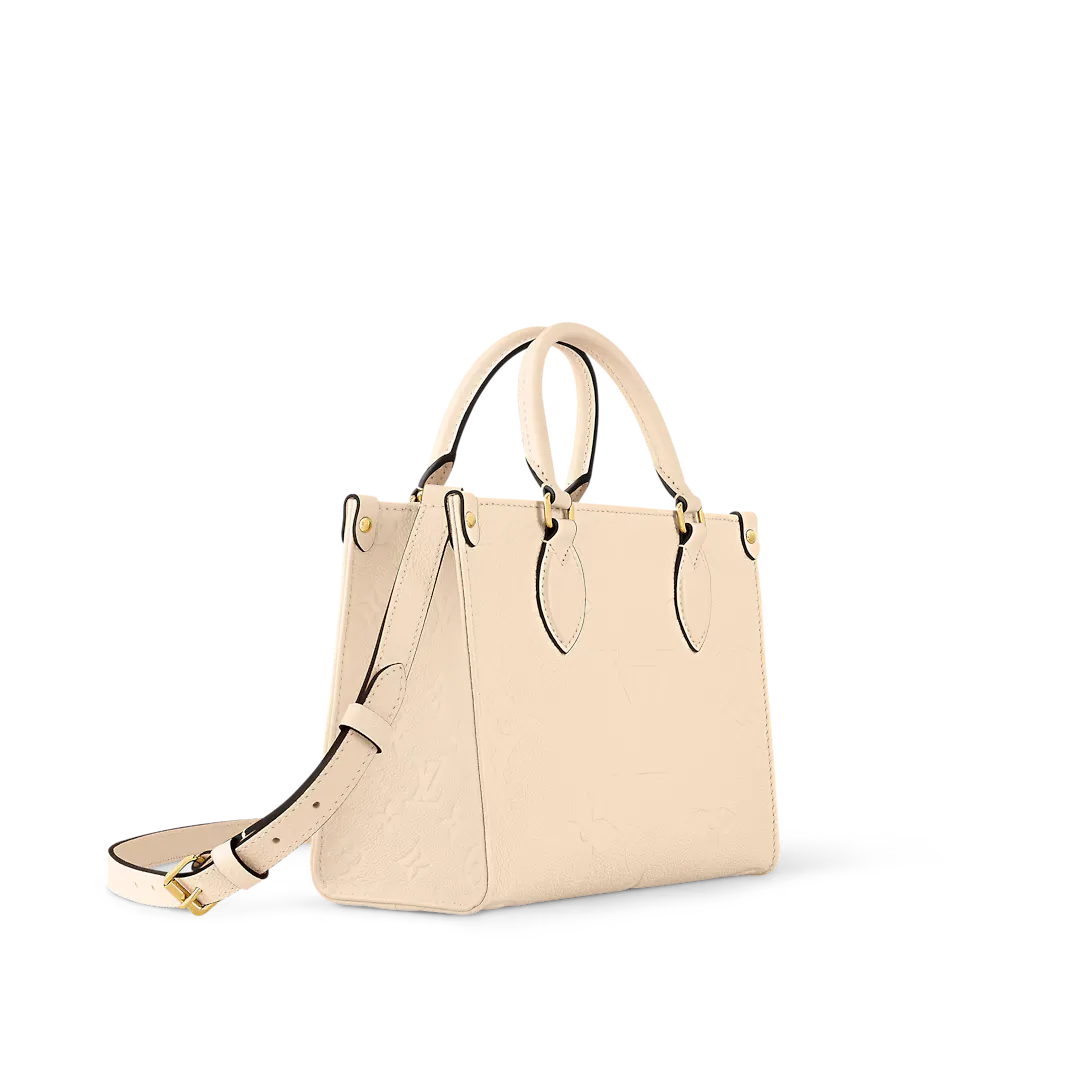 A soft cream-tone makes the Monogram Empreinte leather of this OnTheGo PM bag seem luminous. The LVs and Monogram Flowers embossed into the leather are perfectly complemented by the rectangular lines of this small tote. It can hold smaller essentials like an iPad Mini. Two rolled-leather top handles and a detachable strap give carry options.