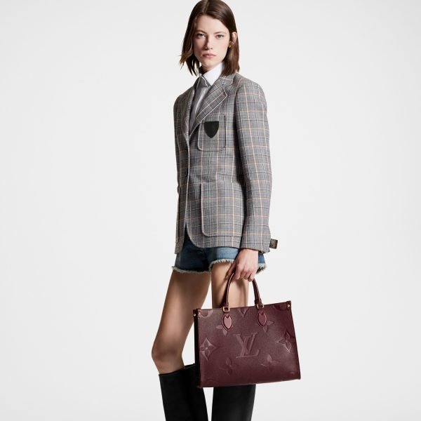 The OnTheGo MM tote is made from grained Monogram Empreinte cowhide leather a soft leather that is embossed with a large Monogram pattern. Large enough for daily essentials such as a laptop it features two sets of handles short and long for carry options. The inside zipped pocket and two inside flat pockets help keep things organized.