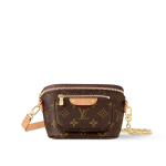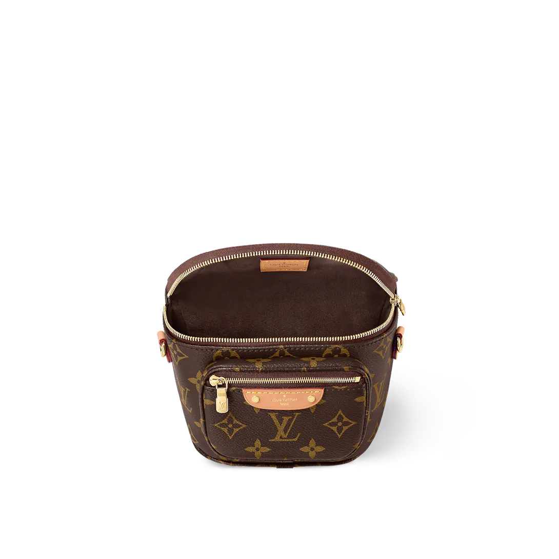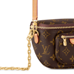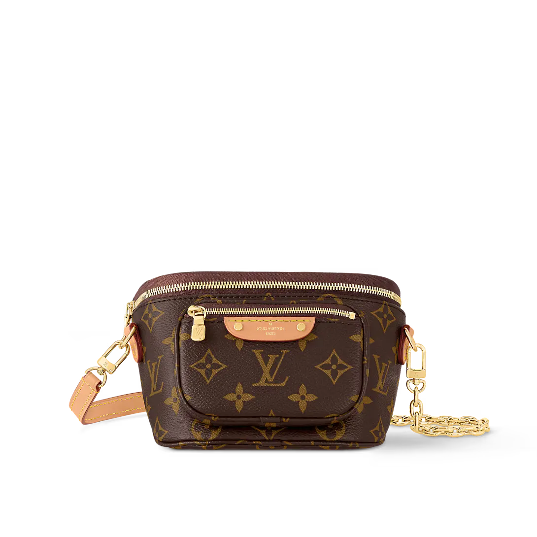 The Mini Bumbag in Monogram canvas is Louis Vuitton’s feminine interpretation of the on-trend bumbag format. Designed for versatility it features a removable adjustable strap in the House’s emblematic natural leather as well as a removable gold-tone chain which can be functional or decorative. The bag has a zipped main compartment and a zipped front pocket with an embossed leather tag.