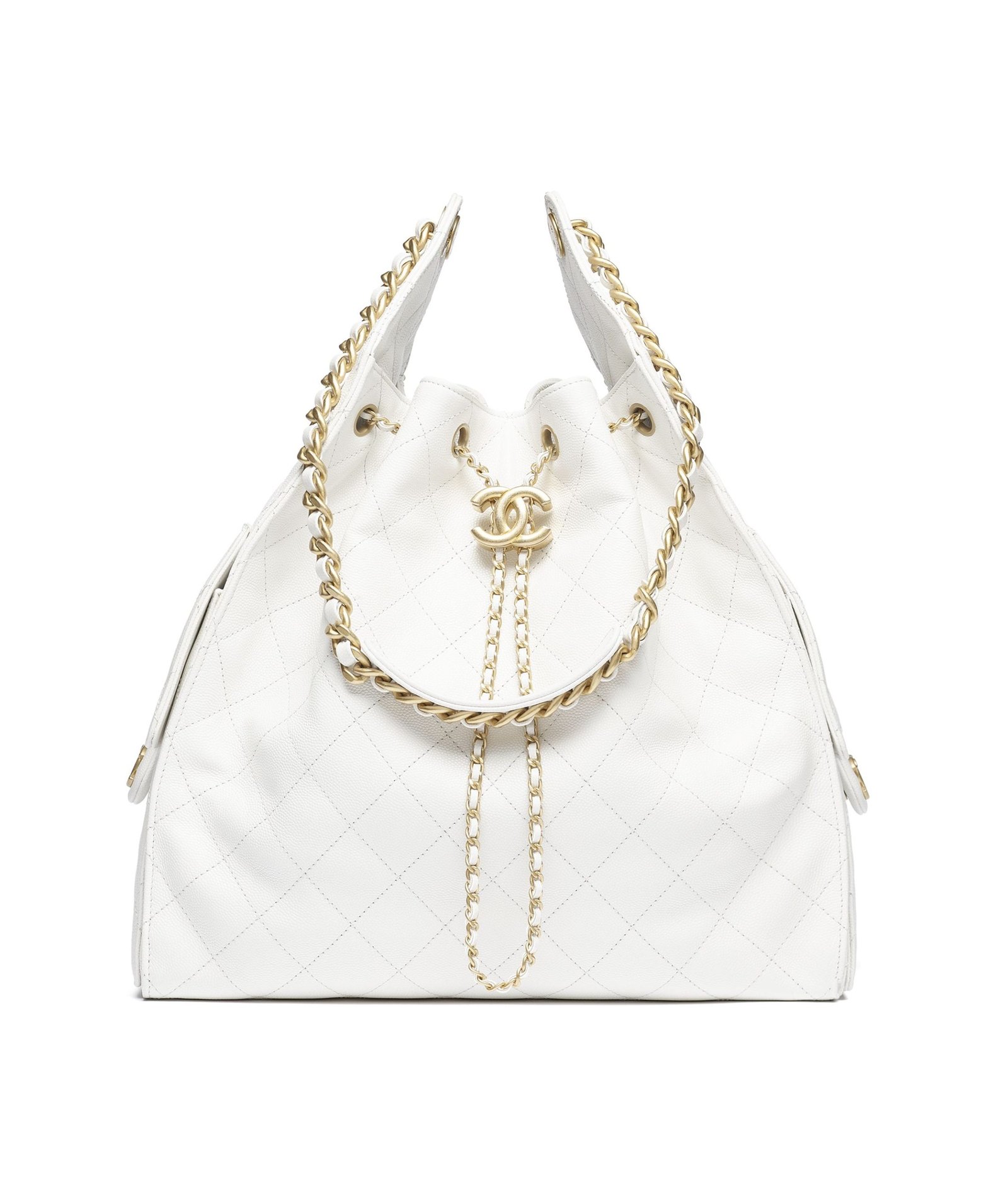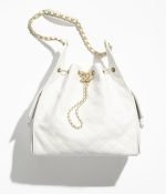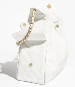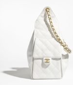 This Chanel Medium 25 Hobo Bag is in white grained calfskin leather with antique gold hardware, features signature diamond quilt, two exterior side pockets, drawstring closure, a removable pouch, and a single interwoven brushed gold and white leather shoulder strap.