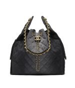 This Chanel Medium 25 Hobo Bag is crafted from black washed denim with antique gold hardware and features signature diamond quilting, two exterior pockets, drawstring closure, removable pouch, and interwoven brushed gold and white leather shoulder straps.