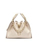 The Chanel Small 25 Hobo Bag is crafted from beige shiny grained calfskin with antique gold hardware and features signature diamond quilting, two exterior pockets, drawstring closure and an interwoven antique gold and white leather shoulder strap.