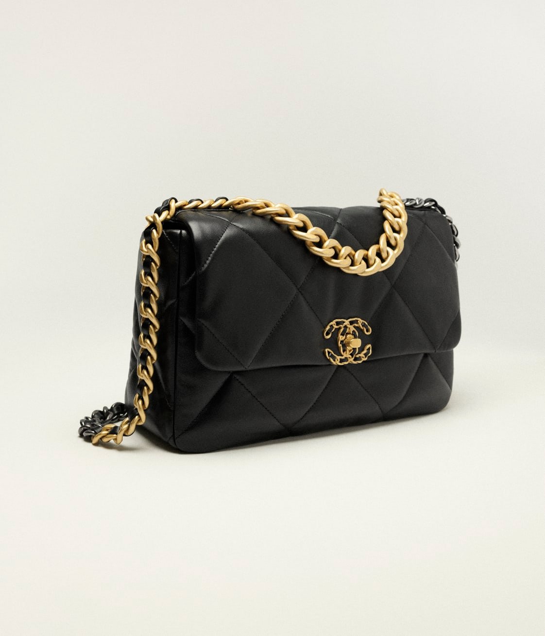 This large 19 flap bag is crafted in black lambskin with mixed metal hardware and features signature diamond quilting, the signature 19 CC interlocking clasp, exterior back pockets, chain top handles and a long shoulder strap in brushed gold, ruthenium and silver tones and a black leather chain.