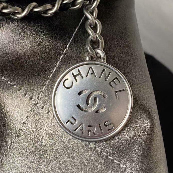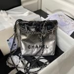 Chanel 22 AS3980 Mini Tote Shiny Calfskin & Silver Metal Silver Black