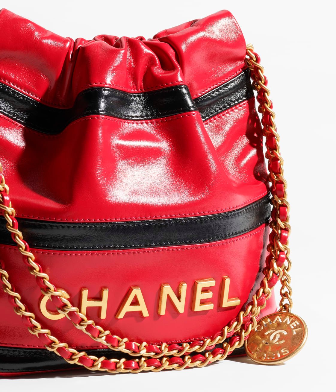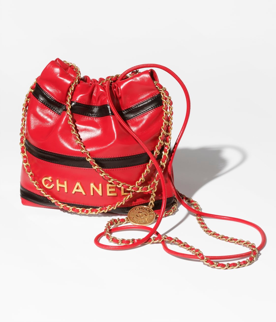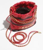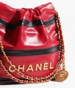 This mini 22 Hobo bag is made of red and black calfskin with gold-tone hardware, features signature diamond quilting, gold-tone metal CHANEL lettering on the front, and a long chain interwoven with gold and red leather.