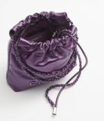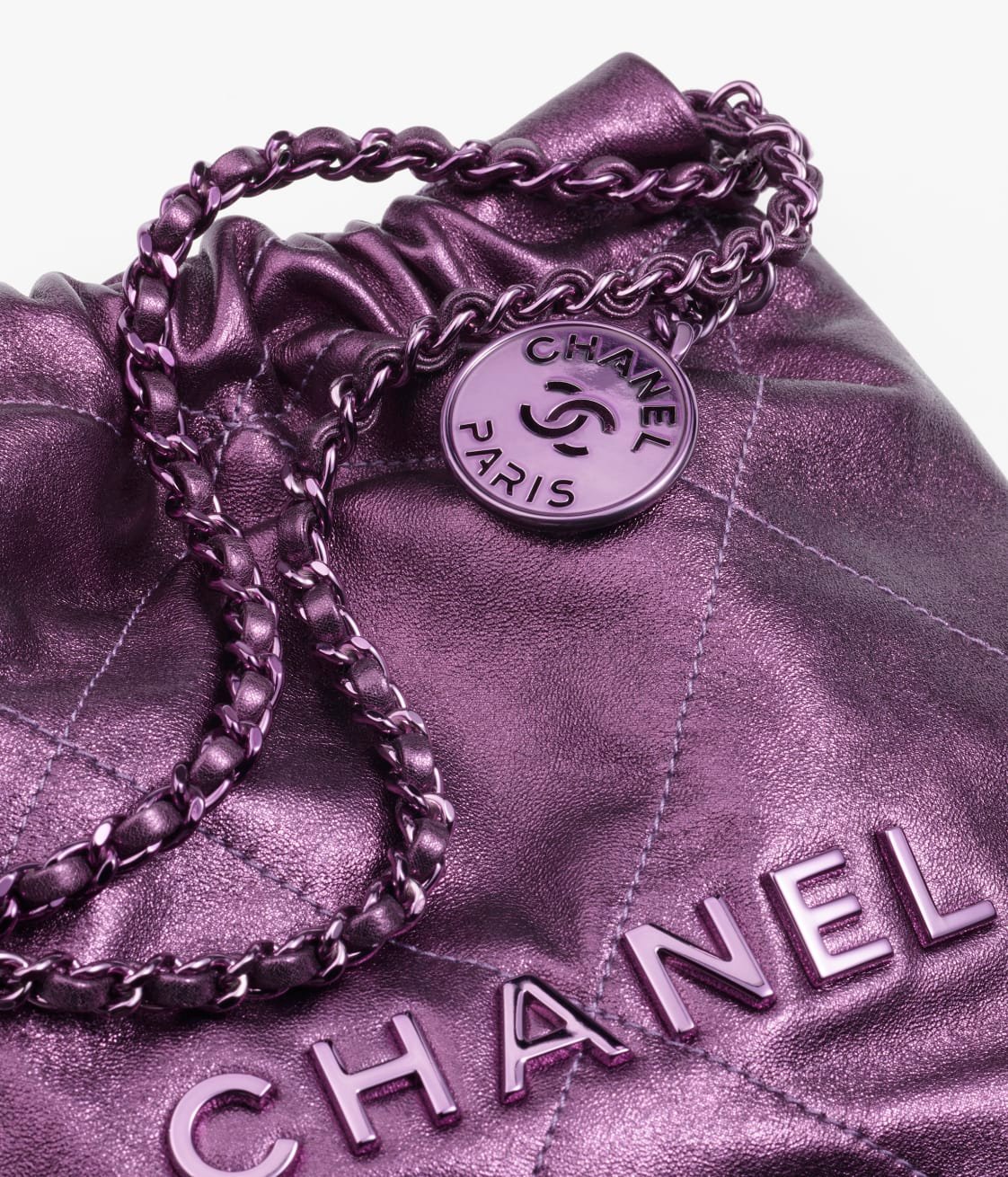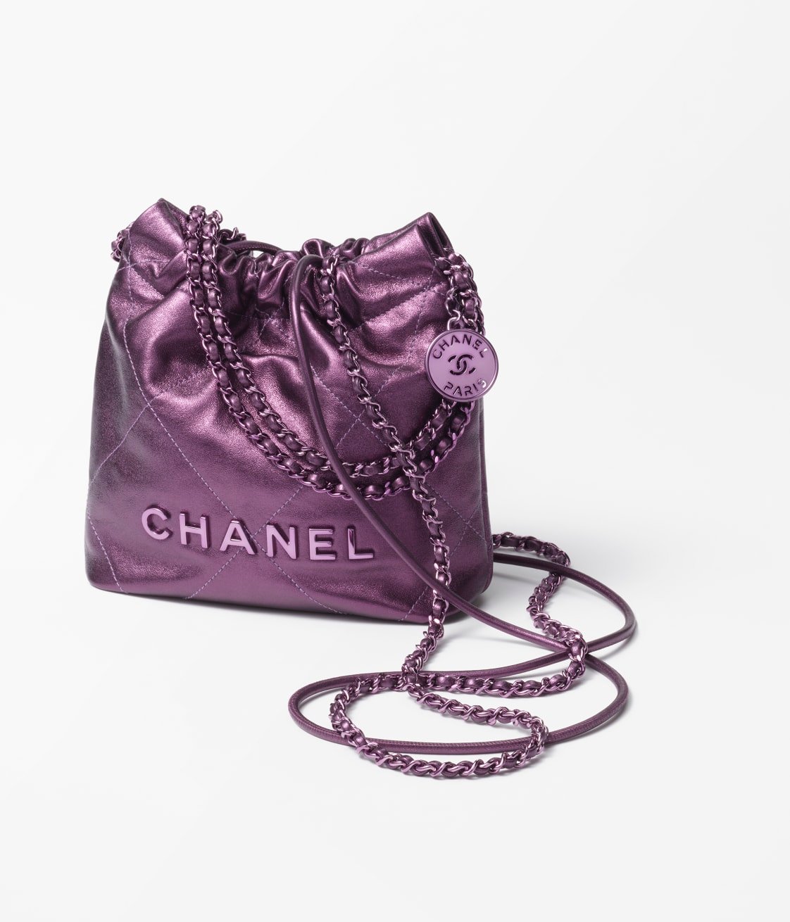 This Chanel Mini 22 Hobo bag is made of dark purple lacquered metallic calfskin with dark purple hardware and signature diamond quilting, dark lacquered metal “Chanel” logo on the front, Chanel Paris metal hangtag, dark purple metallic leather interwoven chain links, long leather cord and long chain link shoulder strap.