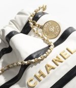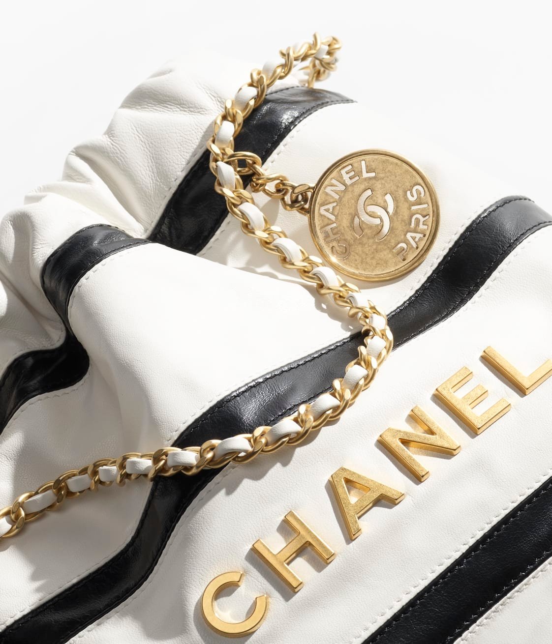 This mini 22 Hobo bag is crafted from black and white calfskin with gold-tone hardware and features signature diamond quilting, gold-tone metal CHANEL lettering on the front, and a long chain interwoven with gold and white leather.