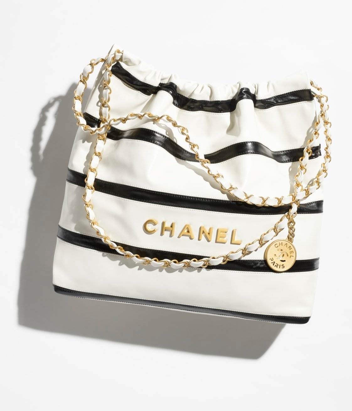 This Small 22 Hobo bag in black and white calfskin with gold-tone hardware, black interior pockets, signature diamond quilting, gold-tone metal CHANEL lettering on the front, and a long gold and white leather chain.