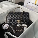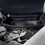 This mini flap bag features a metal top handle and is crafted in black lambskin with gold-tone hardware, front flap with CC turnlock closure, half-moon back pocket, top handle and single interwoven antique gold-tone chain link and black leather shoulder/crossbody strap.
