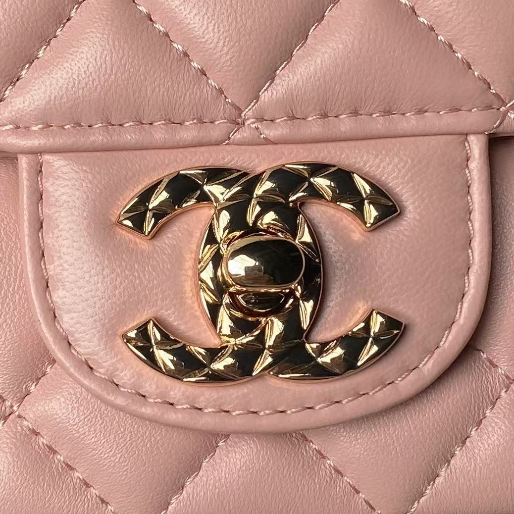 This mini flap bag features a metal top handle, crafted from pink lambskin with gold hardware, front flap with CC turnlock closure, half-moon back pocket, top handle and single interwoven antique gold chain link and pink leather shoulder/crossbody strap.
