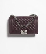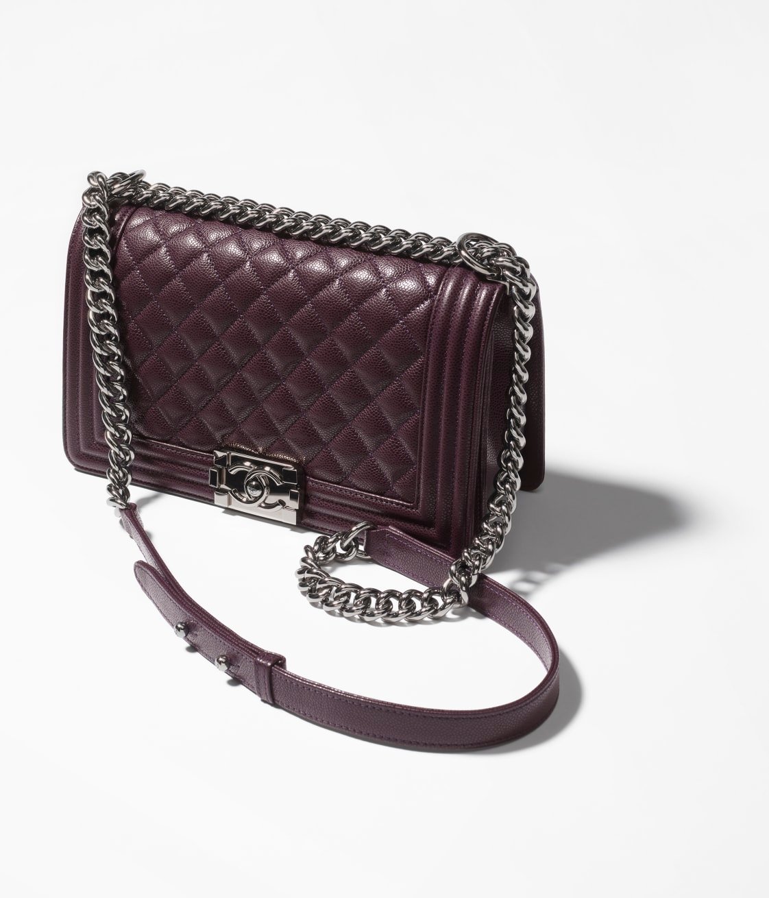 This Chanel Medium Boy Bag is crafted in burgundy lambskin with ruthenium hardware and features a full front flap, Le Boy CC snaps and ruthenium-toned chain links, and a burgundy leather padded shoulder/crossbody strap.