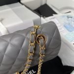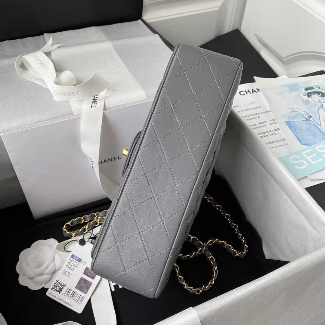 This medium classic double flap bag is crafted in grey lambskin leather with light gold hardware, featuring the signature CC turnlock closure on the front flap, half-moon back pocket, adjustable interwoven light gold chain and grey leather shoulder strap.