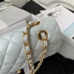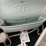 This medium classic double flap bag is made of light blue lambskin leather with light gold hardware, front flap with signature CC turnlock closure, half-moon back pocket, adjustable interwoven light gold chain and light blue leather shoulder strap.