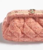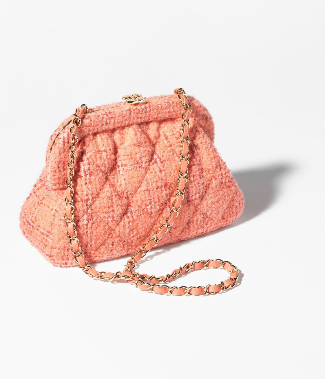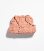 This Chanel Cloud Bag is made of orange and beige wool tweed with gold hardware, front CC logo in quilted satin, pink leather, top CC Kiss lock, interwoven gold-plated chain links and orange leather shoulder/crossbody strap