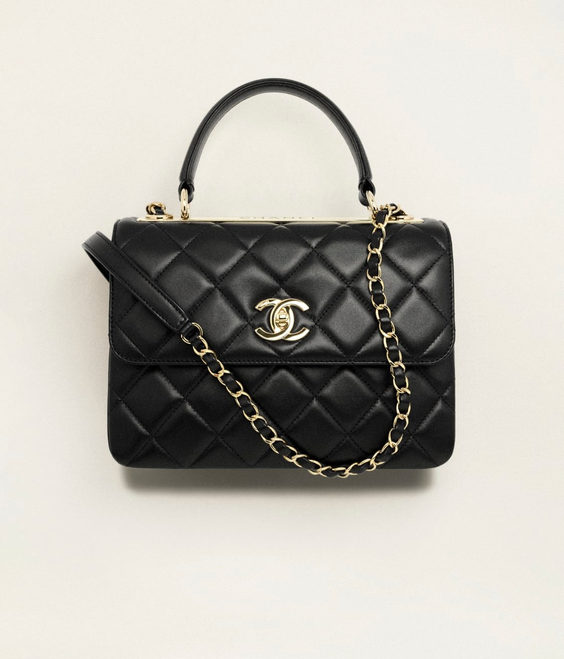 This medium rectangular flap bag with top handle is made of black lambskin with gold hardware, front flap with CC turn lock closure, half moon back pocket, top handle and black leather shoulder/crossbody strap.