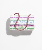 This Chanel Mini Rectangular Flap Bag in colorful sequins and white tweed features light gold hardware, a front flap with CC turnlock closure, half-moon back pockets and interwoven light gold links, and a pink shoulder/crossbody strap.