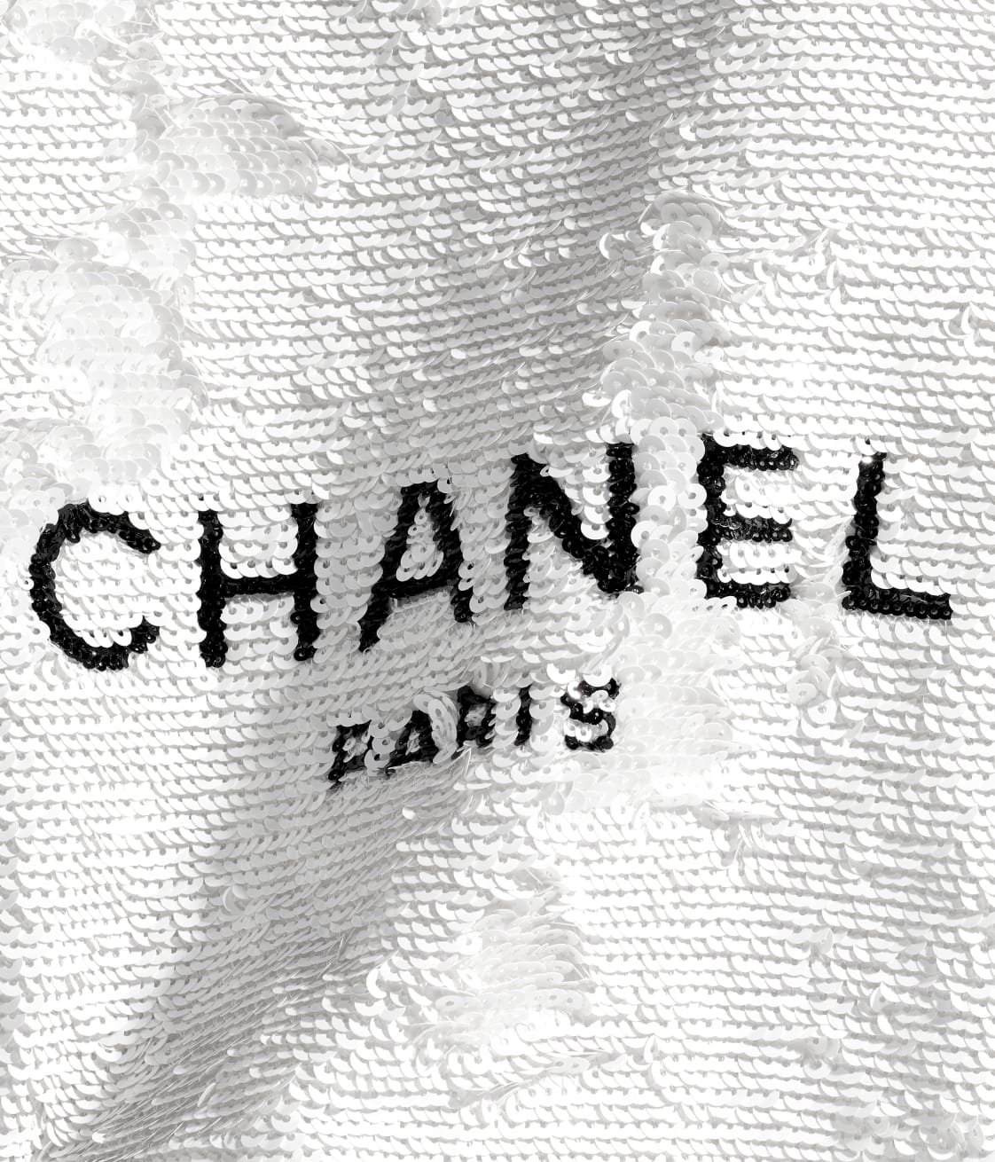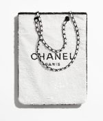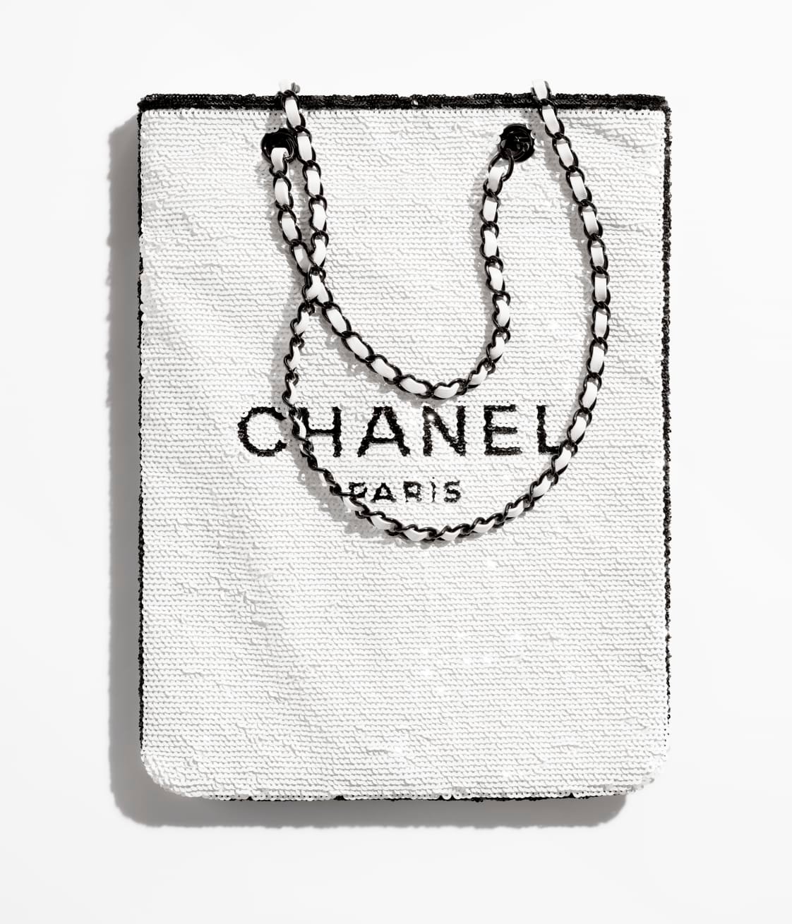 This shopping bag is made of white and black sequins, ribbed satin and leather, with black hardware, tonal stitching, a removable interior pocket, interwoven black metal chain links and a white leather shoulder strap.