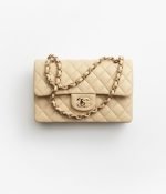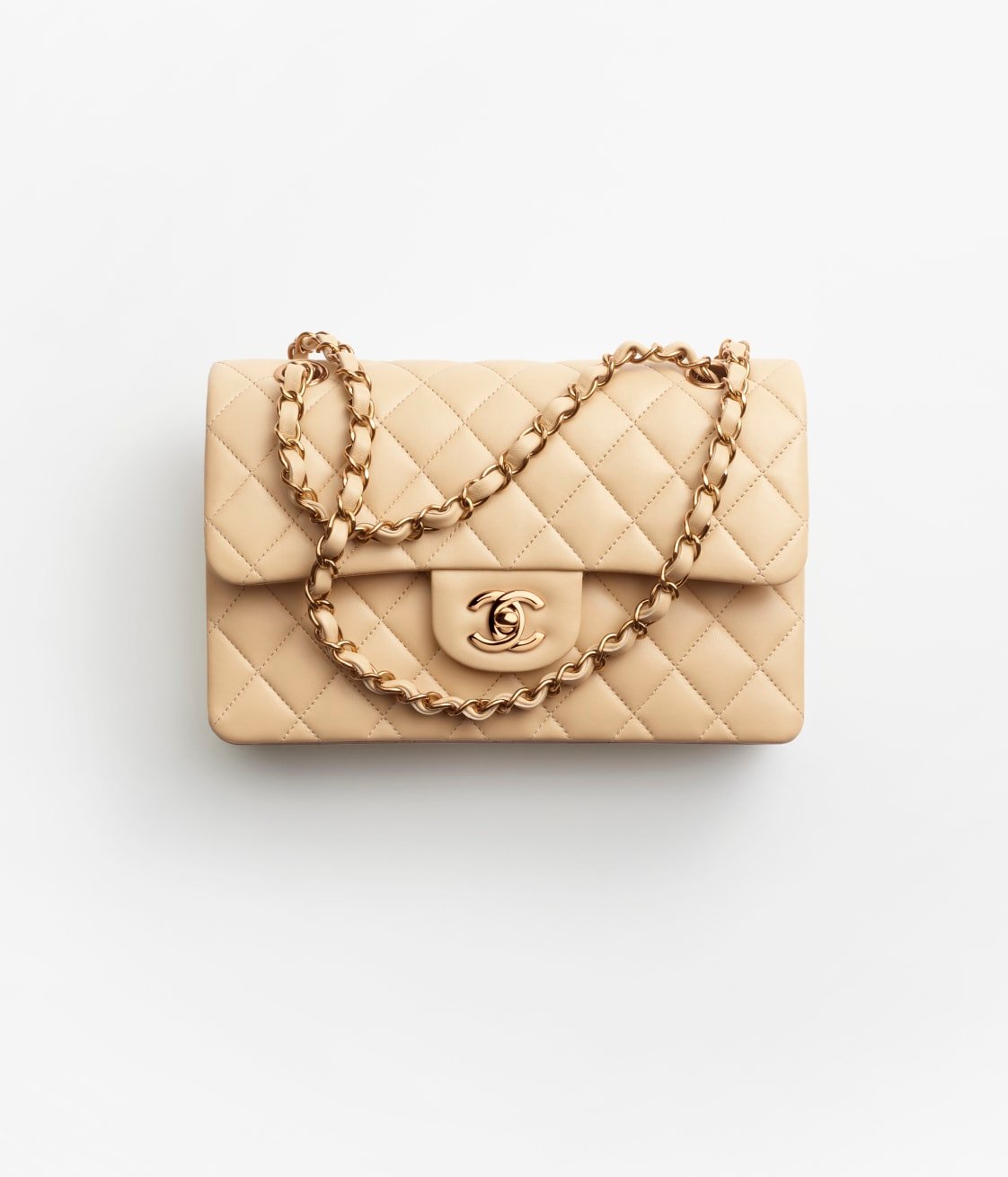 This small classic double flap bag is crafted in beige lambskin with gold hardware, front flap with signature CC turnlock closure, half-moon back pocket and adjustable gold interwoven chain link and beige leather shoulder strap.