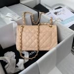 This small classic double flap bag is crafted in beige caviar leather with light gold hardware, front flap with signature CC turnlock closure, half-moon back pocket and adjustable light gold interwoven chain link and beige leather shoulder strap.