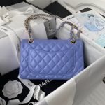 This small classic double flap bag is crafted from lavender lambskin with gold-tone hardware, featuring a front flap with the signature CC turnlock closure, a half-moon back pocket, adjustable gold-tone interwoven chain links and a lavender leather shoulder strap.