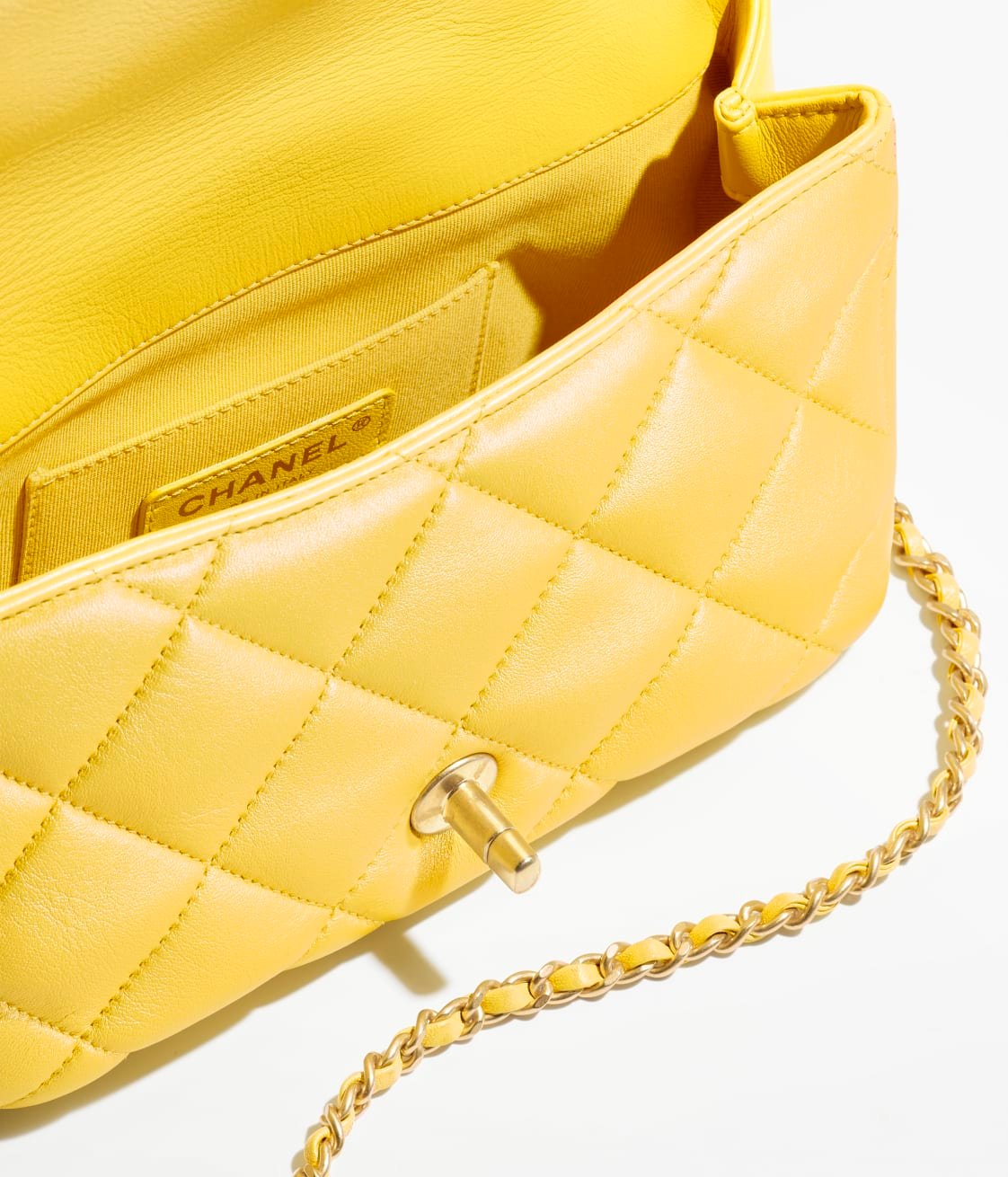 This Chanel Square Double Bead Flap Bag in yellow lambskin with brushed gold hardware features front flap with signature CC turnlock closure, tonal stitching, single interwoven yellow leather and brushed gold chain link pearl shoulder/crossbody strap.