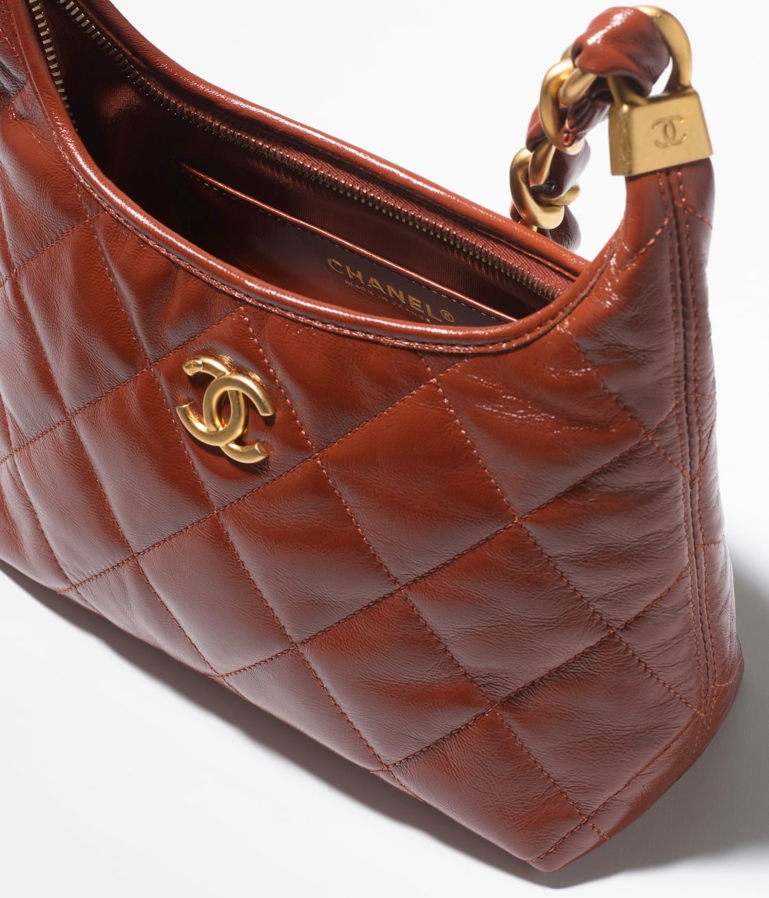 This Chanel Brown Quilted Shiny Crinkled Calfskin Small Hobo Bag features CC logo, shiny crinkled calfskin leather with a beautiful and luxurious feel, distressed/antique gold tone hardware. Lined in fabric. This bag is perfect for everyday use.