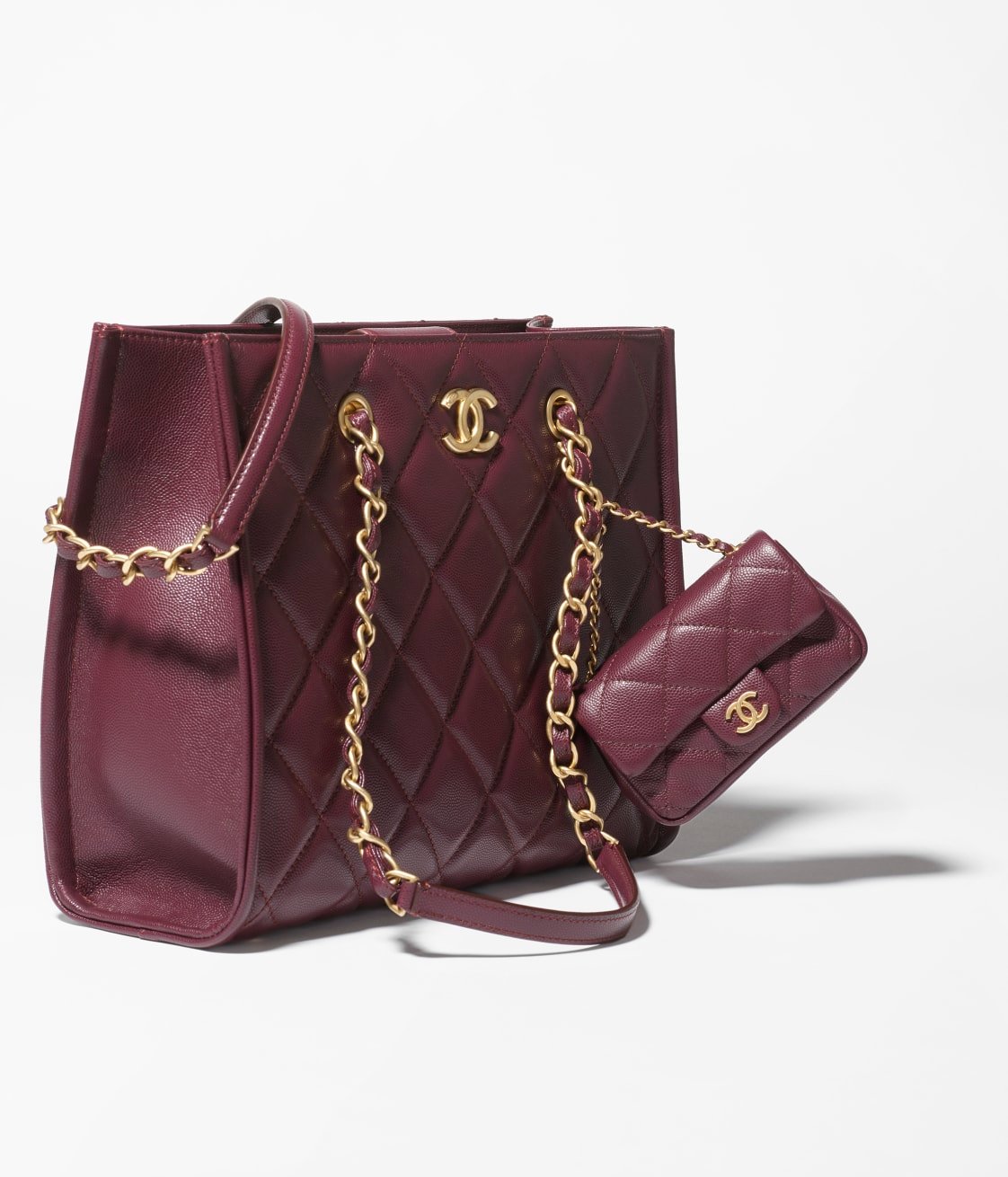 This vintage flap bag is crafted in burgundy grained calfskin with gold hardware, CC turnlock closure on the front, interwoven gold-plated chain links and burgundy leather shoulder/crossbody strap.