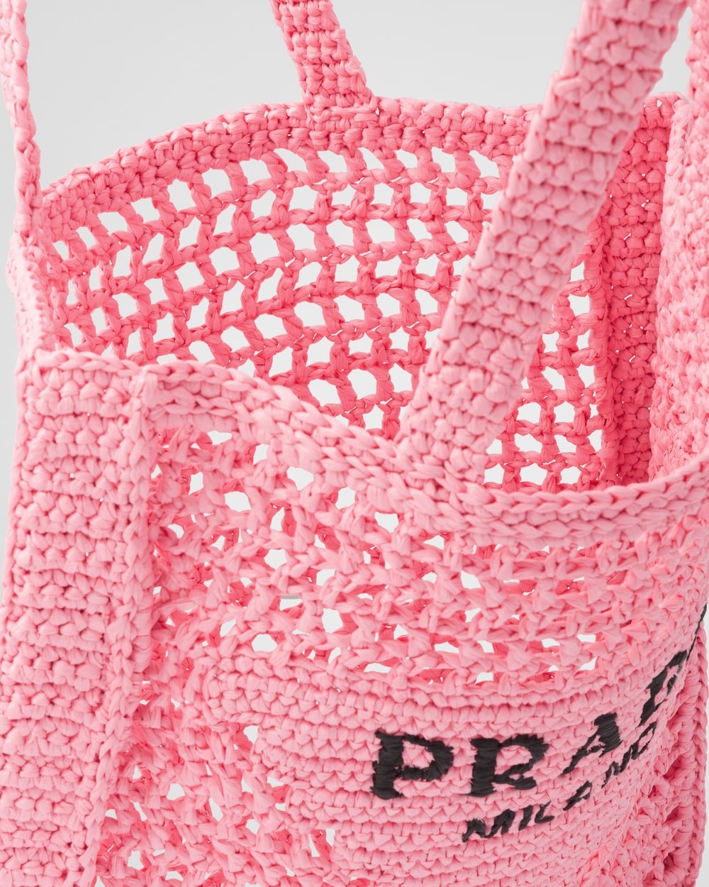 This crochet tote bag with a soft, deconstructed design boasts a light and summery mood. A new interpretation of Prada’s emblematic triangle decorates the front and is embellished at its center with the embroidered lettering logo.