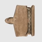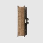 The small Dionysus shoulder bag is presented in the signature GG pattern, trimmed with taupe suede details. The shape is defined by the defining tiger head closure—a unique detail referencing the Greek god Dionysus, who in myth is said to have crossed the river Tigris on a tiger sent to him by Zeus—further enhanced with sparkling crystals. The sliding chain strap can be worn multiple ways, changing between a shoulder, cross-body and a top handle bag.