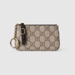 The GG Emblem collection reinterprets signature motifs through creativity and innovative functions , and is envisioned to be cherished for years to come. Introduced in the latest line of small accessories, this beige and dark brown key case is crafted from the new GG Monogram fabric. Featuring a zip closure with a contrasting black leather puller, the inside features a keychain hook.
