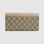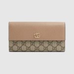 A miniature version of the House’s monogram hardware animates this continental wallet. First appearing in the ’70s as a belt buckle, the Double G is a historic symbol of the House. Here, the accessory is presented in a mix of GG Supreme canvas and dusty pink leather.