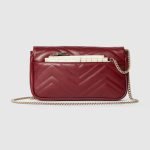 This GG Marmont mini bag is crafted from the new Gucci Rosso Ancora red matelassé chevron leather. The signature Double G hardware in a lighter gold-toned defines the accessory, while a detachable leather card case completes the style in contrasting white leather.